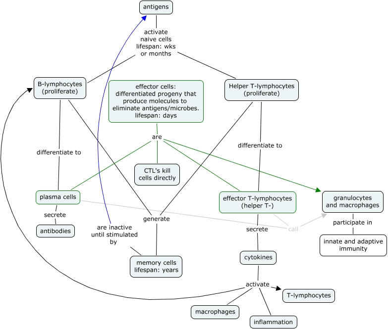 This Concept Map, created with IHMC CmapTools, has information related to: intro - lymphocyte life stages, cytokines activate T-lymphocytes, cytokines activate inflammation, effector cells: differentiated progeny that produce molecules to eliminate antigens/microbes. lifespan: days are effector T-lymphocytes (helper T-), cytokines activate B-lymphocytes (proliferate), plasma cells secrete antibodies, plasma cells call granulocytes and macrophages, cytokines activate macrophages, effector cells: differentiated progeny that produce molecules to eliminate antigens/microbes. lifespan: days are granulocytes and macrophages, granulocytes and macrophages participate in innate and adaptive immunity, antigens activate naive cells lifespan: wks or months B-lymphocytes (proliferate), antigens activate naive cells lifespan: wks or months Helper T-lymphocytes (proliferate), effector T-lymphocytes (helper T-) call granulocytes and macrophages, effector T-lymphocytes (helper T-) secrete cytokines, Helper T-lymphocytes (proliferate) generate memory cells lifespan: years, B-lymphocytes (proliferate) differentiate to plasma cells, memory cells lifespan: years are inactive until stimulated by antigens, Helper T-lymphocytes (proliferate) differentiate to effector T-lymphocytes (helper T-), effector cells: differentiated progeny that produce molecules to eliminate antigens/microbes. lifespan: days are CTL's kill cells directly, effector cells: differentiated progeny that produce molecules to eliminate antigens/microbes. lifespan: days are plasma cells, B-lymphocytes (proliferate) generate memory cells lifespan: years