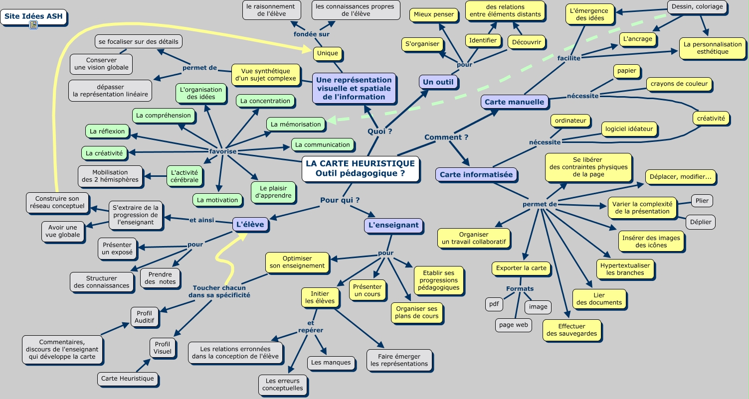Cette carte de concepts créée avec IHMC CmapTools traite de: Carte heuristique outil pédagogique, Dessin, coloriage La mémorisation, Carte manuelle nécessite papier, Unique fondée sur le raisonnement de l'élève, Carte informatisée permet de Déplacer, modifier..., Carte manuelle facilite L'ancrage, Identifier des relations entre éléments distants, Unique fondée sur les connaissances propres de l'élève, Optimiser son enseignement Toucher chacun dans sa spécificité L'élève, Vue synthétique d'un sujet complexe permet de dépasser la représentation linéaire, L'activité cérébrale Mobilisation des 2 hémisphères, LA CARTE HEURISTIQUE Outil pédagogique ? favorise La concentration, Initier les élèves Faire émerger les représentations, Carte informatisée permet de Lier des documents, Un outil pour Découvrir, LA CARTE HEURISTIQUE Outil pédagogique ? Quoi ? Une représentation visuelle et spatiale de l'information, Carte manuelle facilite La personnalisation esthétique, LA CARTE HEURISTIQUE Outil pédagogique ? favorise La communication, Initier les élèves et repérer Les manques, Une représentation visuelle et spatiale de l'information Vue synthétique d'un sujet complexe, Une représentation visuelle et spatiale de l'information Unique