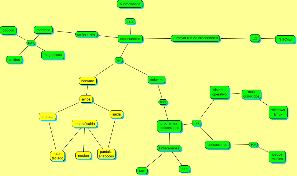 Este Cmap, tiene información relacionada con: tema 2, entrada raton teclado entada\saida, ordenadores la mayor red de ordenadores ES, saida pantalla altaboces entada\saida, A informatica trata ordenadores, memoria son magneticos, entada\saida ???? moden, sofware son programas aplicaciones, sistema operativo mas conocidos windows lynux, memoria son solidos, programas aplicaciones almacenanse ram, harware ainos saida, harware ainos entrada, programas aplicaciones almacenanse rom, ordenadores ten harware, programas aplicaciones hay sistema operativo, ordenadores ten sofware, ordenadores se les mete memoria, ES ???? INTRNET, memoria son opticos, programas aplicaciones hay aplicaciones
