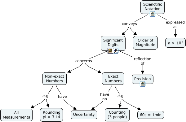 This Concept Map, created with IHMC CmapTools, has information related to: Scientific Notation, Significant Digits concerns Exact Numbers, Non-exact Numbers e.g. All Measurements, Non-exact Numbers e.g. Rounding pi = 3.14, Significant Digits concerns Non-exact Numbers, Scienctific Notation conveys Significant Digits, Exact Numbers have no Uncertainty, Scienctific Notation expressed as <math xmlns="http://www.w3.org/1998/Math/MathML"> <mrow> <mtext> a × </mtext> <mmultiscripts> <mtext> 10 </mtext> <none/> <mtext> b </mtext> </mmultiscripts> </mrow> </math>, Significant Digits reflection of Precision, Exact Numbers e.g. 60s = 1min, Non-exact Numbers have Uncertainty, Exact Numbers e.g. Counting (3 people), Scienctific Notation conveys Order of Magnitude