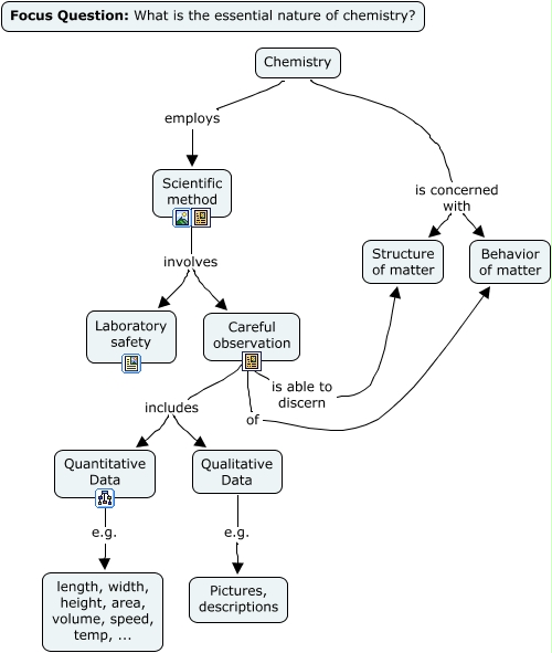 This Concept Map, created with IHMC CmapTools, has information related to: Unit 01 - The Science of Chemistry, Scientific method involves Laboratory safety, Careful observation is able to discern Structure of matter, Chemistry is concerned with Structure of matter, Quantitative Data e.g. length, width, height, area, volume, speed, temp, ..., Qualitative Data e.g. Pictures, descriptions, Careful observation includes Quantitative Data, Careful observation of Behavior of matter, Careful observation includes Qualitative Data, Chemistry is concerned with Behavior of matter, Chemistry employs Scientific method, Scientific method involves Careful observation