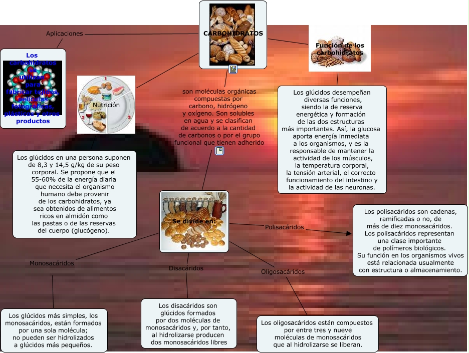 Este Cmap, tiene información relacionada con: carbohidratos, CARBOHIDRATOS Aplicaciones Los carbohidratos se utilizan para fabricar tejidos, películas fotográficas, plásticos y otros productos, CARBOHIDRATOS son moléculas orgánicas compuestas por carbono, hidrógeno y oxígeno. Son solubles en agua y se clasifican de acuerdo a la cantidad de carbonos o por el grupo funcional que tienen adherido Se divide en:, Se divide en: Oligosacáridos Los oligosacáridos están compuestos por entre tres y nueve moléculas de monosacáridos que al hidrolizarse se liberan., Se divide en: Polisacáridos Los polisacáridos son cadenas, ramificadas o no, de más de diez monosacáridos. Los polisacáridos representan una clase importante de polímeros biológicos. Su función en los organismos vivos está relacionada usualmente con estructura o almacenamiento., Se divide en: Monosacáridos Los glúcidos más simples, los monosacáridos, están formados por una sola molécula; no pueden ser hidrolizados a glúcidos más pequeños., CARBOHIDRATOS Función de los carbohidratos Los glúcidos desempeñan diversas funciones, siendo la de reserva energética y formación de las dos estructuras más importantes. Así, la glucosa aporta energía inmediata a los organismos, y es la responsable de mantener la actividad de los músculos, la temperatura corporal, la tensión arterial, el correcto funcionamiento del intestino y la actividad de las neuronas., CARBOHIDRATOS Nutrición Los glúcidos en una persona suponen de 8,3 y 14,5 g/kg de su peso corporal. Se propone que el 55-60% de la energía diaria que necesita el organismo humano debe provenir de los carbohidratos, ya sea obtenidos de alimentos ricos en almidón como las pastas o de las reservas del cuerpo (glucógeno)., Se divide en: Disacáridos Los disacáridos son glúcidos formados por dos moléculas de monosacáridos y, por tanto, al hidrolizarse producen dos monosacáridos libres