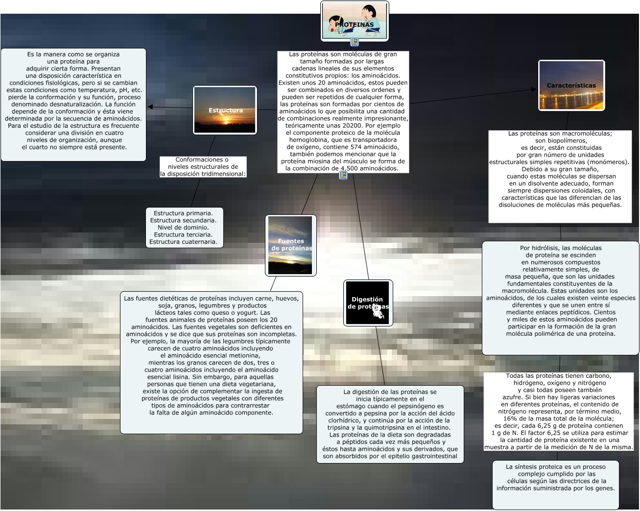 Este Cmap, tiene información relacionada con: PROTEINAS.,J, Por hidrólisis, las moléculas de proteína se escinden en numerosos compuestos relativamente simples, de masa pequeña, que son las unidades fundamentales constituyentes de la macromolécula. Estas unidades son los aminoácidos, de los cuales existen veinte especies diferentes y que se unen entre sí mediante enlaces peptídicos. Cientos y miles de estos aminoácidos pueden participar en la formación de la gran molécula polimérica de una proteína. Todas las proteínas tienen carbono, hidrógeno, oxígeno y nitrógeno y casi todas poseen también azufre. Si bien hay ligeras variaciones en diferentes proteínas, el contenido de nitrógeno representa, por término medio, 16% de la masa total de la molécula; es decir, cada 6,25 g de proteína contienen 1 g de N. El factor 6,25 se utiliza para estimar la cantidad de proteína existente en una muestra a partir de la medición de N de la misma. La síntesis proteica es un proceso complejo cumplido por las células según las directrices de la información suministrada por los genes., Estructura Conformaciones o niveles estructurales de la disposición tridimensional: Estructura primaria. Estructura secundaria. Nivel de dominio. Estructura terciaria. Estructura cuaternaria., PROTEINAS Las proteínas son moléculas de gran tamaño formadas por largas cadenas lineales de sus elementos constitutivos propios: los aminoácidos. Existen unos 20 aminoácidos, estos pueden ser combinados en diversos ordenes y pueden ser repetidos de cualquier forma, las proteínas son formadas por cientos de aminoácidos lo que posibilita una cantidad de combinaciones realmente impresionante, teóricamente unas 20200. Por ejemplo el componente proteico de la molécula hemoglobina, que es transportadora de oxígeno, contiene 574 aminoácido, también podemos mencionar que la proteína miosina del músculo se forma de la combinación de 4.500 aminoácidos. Es la manera como se organiza una proteína para adquirir cierta forma. Presentan una disposición característica en condiciones fisiológicas, pero si se cambian estas condiciones como temperatura, pH, etc. pierde la conformación y su función, proceso denominado desnaturalización. La función depende de la conformación y ésta viene determinada por la secuencia de aminoácidos. Para el estudio de la estructura es frecuente considerar una división en cuatro niveles de organización, aunque el cuarto no siempre está presente., PROTEINAS Las proteínas son moléculas de gran tamaño formadas por largas cadenas lineales de sus elementos constitutivos propios: los aminoácidos. Existen unos 20 aminoácidos, estos pueden ser combinados en diversos ordenes y pueden ser repetidos de cualquier forma, las proteínas son formadas por cientos de aminoácidos lo que posibilita una cantidad de combinaciones realmente impresionante, teóricamente unas 20200. Por ejemplo el componente proteico de la molécula hemoglobina, que es transportadora de oxígeno, contiene 574 aminoácido, también podemos mencionar que la proteína miosina del músculo se forma de la combinación de 4.500 aminoácidos. Características, PROTEINAS Las proteínas son moléculas de gran tamaño formadas por largas cadenas lineales de sus elementos constitutivos propios: los aminoácidos. Existen unos 20 aminoácidos, estos pueden ser combinados en diversos ordenes y pueden ser repetidos de cualquier forma, las proteínas son formadas por cientos de aminoácidos lo que posibilita una cantidad de combinaciones realmente impresionante, teóricamente unas 20200. Por ejemplo el componente proteico de la molécula hemoglobina, que es transportadora de oxígeno, contiene 574 aminoácido, también podemos mencionar que la proteína miosina del músculo se forma de la combinación de 4.500 aminoácidos. Las fuentes dietéticas de proteínas incluyen carne, huevos, soja, granos, legumbres y productos lácteos tales como queso o yogurt. Las fuentes animales de proteínas poseen los 20 aminoácidos. Las fuentes vegetales son deficientes en aminoácidos y se dice que sus proteínas son incompletas. Por ejemplo, la mayoría de las legumbres típicamente carecen de cuatro aminoácidos incluyendo el aminoácido esencial metionina, mientras los granos carecen de dos, tres o cuatro aminoácidos incluyendo el aminoácido esencial lisina. Sin embargo, para aquellas personas que tienen una dieta vegetariana, existe la opción de complementar la ingesta de proteínas de productos vegetales con diferentes tipos de aminoácidos para contrarrestar la falta de algún aminoácido componente., Características Las proteínas son macromoléculas; son biopolímeros, es decir, están constituidas por gran número de unidades estructurales simples repetitivas (monómeros). Debido a su gran tamaño, cuando estas moléculas se dispersan en un disolvente adecuado, forman siempre dispersiones coloidales, con características que las diferencian de las disoluciones de moléculas más pequeñas. Por hidrólisis, las moléculas de proteína se escinden en numerosos compuestos relativamente simples, de masa pequeña, que son las unidades fundamentales constituyentes de la macromolécula. Estas unidades son los aminoácidos, de los cuales existen veinte especies diferentes y que se unen entre sí mediante enlaces peptídicos. Cientos y miles de estos aminoácidos pueden participar en la formación de la gran molécula polimérica de una proteína., PROTEINAS Las proteínas son moléculas de gran tamaño formadas por largas cadenas lineales de sus elementos constitutivos propios: los aminoácidos. Existen unos 20 aminoácidos, estos pueden ser combinados en diversos ordenes y pueden ser repetidos de cualquier forma, las proteínas son formadas por cientos de aminoácidos lo que posibilita una cantidad de combinaciones realmente impresionante, teóricamente unas 20200. Por ejemplo el componente proteico de la molécula hemoglobin