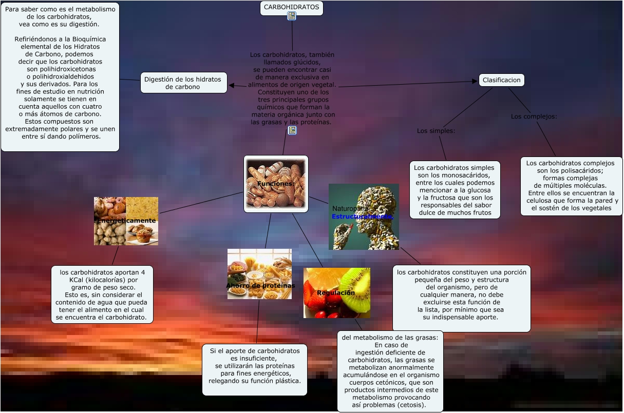 Este Cmap, tiene información relacionada con: carbohidratos, Funciones: Regulación del metabolismo de las grasas: En caso de ingestión deficiente de carbohidratos, las grasas se metabolizan anormalmente acumulándose en el organismo cuerpos cetónicos, que son productos intermedios de este metabolismo provocando así problemas (cetosis)., Clasificacion Los simples: Los carbohidratos simples son los monosacáridos, entre los cuales podemos mencionar a la glucosa y la fructosa que son los responsables del sabor dulce de muchos frutos, Funciones: Ahorro de proteínas Si el aporte de carbohidratos es insuficiente, se utilizarán las proteínas para fines energéticos, relegando su función plástica., Clasificacion Los complejos: Los carbohidratos complejos son los polisacáridos; formas complejas de múltiples moléculas. Entre ellos se encuentran la celulosa que forma la pared y el sostén de los vegetales, Digestión de los hidratos de carbono ???? Para saber como es el metabolismo de los carbohidratos, vea como es su digestión. Refiriéndonos a la Bioquímica elemental de los Hidratos de Carbono, podemos decir que los carbohidratos son polihidroxicetonas o polihidroxialdehidos y sus derivados. Para los fines de estudio en nutrición solamente se tienen en cuenta aquellos con cuatro o más átomos de carbono. Estos compuestos son extremadamente polares y se unen entre sí dando polímeros., Funciones: Estructuralmente, los carbohidratos constituyen una porción pequeña del peso y estructura del organismo, pero de cualquier manera, no debe excluirse esta función de la lista, por mínimo que sea su indispensable aporte., CARBOHIDRATOS Los carbohidratos, también llamados glúcidos, se pueden encontrar casi de manera exclusiva en alimentos de origen vegetal. Constituyen uno de los tres principales grupos químicos que forman la materia orgánica junto con las grasas y las proteínas. Digestión de los hidratos de carbono, CARBOHIDRATOS Los carbohidratos, también llamados glúcidos, se pueden encontrar casi de manera exclusiva en alimentos de origen vegetal. Constituyen uno de los tres principales grupos químicos que forman la materia orgánica junto con las grasas y las proteínas. Clasificacion, CARBOHIDRATOS Los carbohidratos, también llamados glúcidos, se pueden encontrar casi de manera exclusiva en alimentos de origen vegetal. Constituyen uno de los tres principales grupos químicos que forman la materia orgánica junto con las grasas y las proteínas., Funciones: Energeticamente los carbohidratos aportan 4 KCal (kilocalorías) por gramo de peso seco. Esto es, sin considerar el contenido de agua que pueda tener el alimento en el cual se encuentra el carbohidrato.