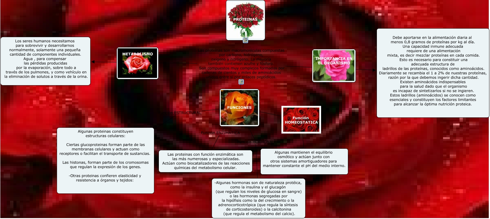 Este Cmap, tiene información relacionada con: PROTEINAS,M, FUNCIONES Función ESTRUCTURAL Algunas proteinas constituyen estructuras celulares: Ciertas glucoproteinas forman parte de las membranas celulares y actuan como receptores o facilitan el transporte de sustancias. Las histonas, forman parte de los cromosomas que regulan la expresión de los genes. -Otras proteinas confieren elasticidad y resistencia a órganos y tejidos:, PROTEINAS Las proteínas son macromoléculas compuestas por carbono, hidrógeno, oxígeno y nitrógeno. La mayoría también contienen azufre y fósforo. Son compuestos muy complejos formados por cadenas de cientos y miles de aminoácidos unidos entre sí por enlaces peptídicos. Los seres humanos necesitamos para sobrevivir y desarrollarnos normalmente, solamente una pequeña cantidad de componentes individuales. Agua , para compensar las pérdidas producidas por la evaporación, sobre todo a través de los pulmones, y como vehículo en la eliminación de solutos a través de la orina., FUNCIONES Función HOMEOSTATICA Algunas mantienen el equilibrio osmótico y actúan junto con otros sistemas amortiguadores para mantener constante el pH del medio interno., FUNCIONES Función HORMONAL -Algunas hormonas son de naturaleza protéica, como la insulina y el glucagón (que regulan los niveles de glucosa en sangre) o las hormonas segregadas por la hipófisis como la del crecimiento o la adrenocorticotrópica (que regula la síntesis de corticosteroides) o la calcitonina (que regula el metabolismo del calcio)., PROTEINAS Las proteínas son macromoléculas compuestas por carbono, hidrógeno, oxígeno y nitrógeno. La mayoría también contienen azufre y fósforo. Son compuestos muy complejos formados por cadenas de cientos y miles de aminoácidos unidos entre sí por enlaces peptídicos. Debe aportarse en la alimentación diaria al menos 0,8 gramos de proteínas por kg al día. Una capacidad inmune adecuada requiere de una alimentación mixta, es decir mezclar proteínas en cada comida. Esto es necesario para constituir una adecuada estructura de ladrillos de las proteínas, conocidos como aminoácidos. Diariamente se recambia el 1 a 2% de nuestras proteínas, razón por la que debemos ingerir dicha cantidad. Existen aminoácidos indispensables para la salud dado que el organismo es incapaz de sintetizarlos si no se ingieren. Estos ladrillos (aminoácidos) se conocen como esenciales y constituyen los factores limitantes para alcanzar la óptima nutrición proteica., PROTEINAS Las proteínas son macromoléculas compuestas por carbono, hidrógeno, oxígeno y nitrógeno. La mayoría también contienen azufre y fósforo. Son compuestos muy complejos formados por cadenas de cientos y miles de aminoácidos unidos entre sí por enlaces peptídicos. FUNCIONES, FUNCIONES Función ENZIMATICA Las proteinas con función enzimática son las más numerosas y especializadas. Actúan como biocatalizadores de las reacciones químicas del metabolismo celular.