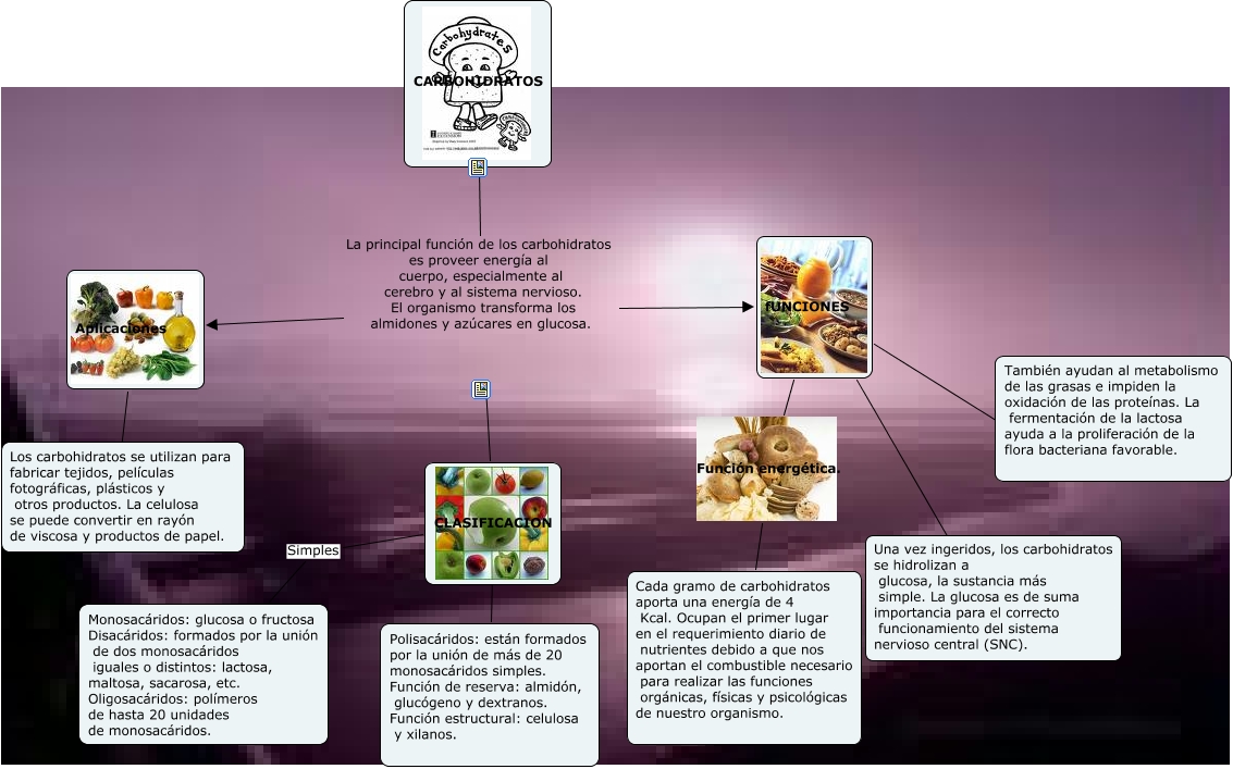 Este Cmap, tiene información relacionada con: carbohidratos3, Aplicaciones ???? Los carbohidratos se utilizan para fabricar tejidos, películas fotográficas, plásticos y otros productos. La celulosa se puede convertir en rayón de viscosa y productos de papel., fUNCIONES Función energética. Cada gramo de carbohidratos aporta una energía de 4 Kcal. Ocupan el primer lugar en el requerimiento diario de nutrientes debido a que nos aportan el combustible necesario para realizar las funciones orgánicas, físicas y psicológicas de nuestro organismo., CLASIFICACION Complejos Polisacáridos: están formados por la unión de más de 20 monosacáridos simples. Función de reserva: almidón, glucógeno y dextranos. Función estructural: celulosa y xilanos., CARBOHIDRATOS La principal función de los carbohidratos es proveer energía al cuerpo, especialmente al cerebro y al sistema nervioso. El organismo transforma los almidones y azúcares en glucosa. CLASIFICACION, CLASIFICACION Simples Monosacáridos: glucosa o fructosa Disacáridos: formados por la unión de dos monosacáridos iguales o distintos: lactosa, maltosa, sacarosa, etc. Oligosacáridos: polímeros de hasta 20 unidades de monosacáridos., fUNCIONES ???? Una vez ingeridos, los carbohidratos se hidrolizan a glucosa, la sustancia más simple. La glucosa es de suma importancia para el correcto funcionamiento del sistema nervioso central (SNC)., fUNCIONES ???? También ayudan al metabolismo de las grasas e impiden la oxidación de las proteínas. La fermentación de la lactosa ayuda a la proliferación de la flora bacteriana favorable., CARBOHIDRATOS La principal función de los carbohidratos es proveer energía al cuerpo, especialmente al cerebro y al sistema nervioso. El organismo transforma los almidones y azúcares en glucosa. fUNCIONES, CARBOHIDRATOS La principal función de los carbohidratos es proveer energía al cuerpo, especialmente al cerebro y al sistema nervioso. El organismo transforma los almidones y azúcares en glucosa. Aplicaciones