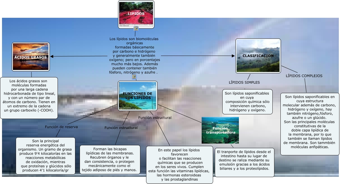 Este Cmap, tiene información relacionada con: LIPIDOS, CLASIFICACION L�?PIDOS SIMPLES Son lípidos saponificables en cuya composición química sólo intervienen carbono, hidrógeno y oxígeno., FUNCIONES DE LOS L�?PIDOS Función de reserva Son la principal reserva energética del organismo. Un gramo de grasa produce 9'4 kilocalorías en las reacciones metabólicas de oxidación, mientras que proteínas y glúcidos sólo producen 4'1 kilocaloría/gr, LIPIDOS Los lípidos son biomoléculas orgánicas formadas básicamente por carbono e hidrógeno y generalmente también oxígeno; pero en porcentajes mucho más bajos. Además pueden contener también fósforo, nitrógeno y azufre . �?CIDOS GRASOS, �?CIDOS GRASOS ???? Los ácidos grasos son moléculas formadas por una larga cadena hidrocarbonada de tipo lineal, y con un número par de átomos de carbono. Tienen en un extremo de la cadena un grupo carboxilo (-COOH)., FUNCIONES DE LOS L�?PIDOS Función estructural En este papel los lípidos favorecen o facilitan las reacciones químicas que se producen en los seres vivos. Cumplen esta función las vitaminas lipídicas, las hormonas esteroideas y las prostaglandinas, FUNCIONES DE LOS L�?PIDOS Función estructural Forman las bicapas lipídicas de las membranas. Recubren órganos y le dan consistencia, o protegen mecánicamente como el tejido adiposo de piés y manos., FUNCIONES DE LOS L�?PIDOS Función transportadora El tranporte de lípidos desde el intestino hasta su lugar de destino se raliza mediante su emulsión gracias a los ácidos biliares y a los proteolípidos., CLASIFICACION L�?PIDOS COMPLEJOS Son lípidos saponificables en cuya estructura molecular además de carbono, hidrógeno y oxígeno, hay también nitrógeno,fósforo, azufre o un glúcido. Son las principales moléculas constitutivas de la doble capa lipídica de la membrana, por lo que también se llaman lípidos de membrana. Son tammbién moléculas anfipáticas., LIPIDOS Los lípidos son biomoléculas orgánicas formadas básicamente por carbono e hidrógeno y generalmente también oxígeno; pero en porcentajes mucho más bajos. Además pueden contener también fósforo, nitrógeno y azufre . FUNCIONES DE LOS L�?PIDOS, LIPIDOS Los lípidos son biomoléculas orgánicas formadas básicamente por carbono e hidrógeno y generalmente también oxígeno; pero en porcentajes mucho más bajos. Además pueden contener también fósforo, nitrógeno y azufre . CLASIFICACION