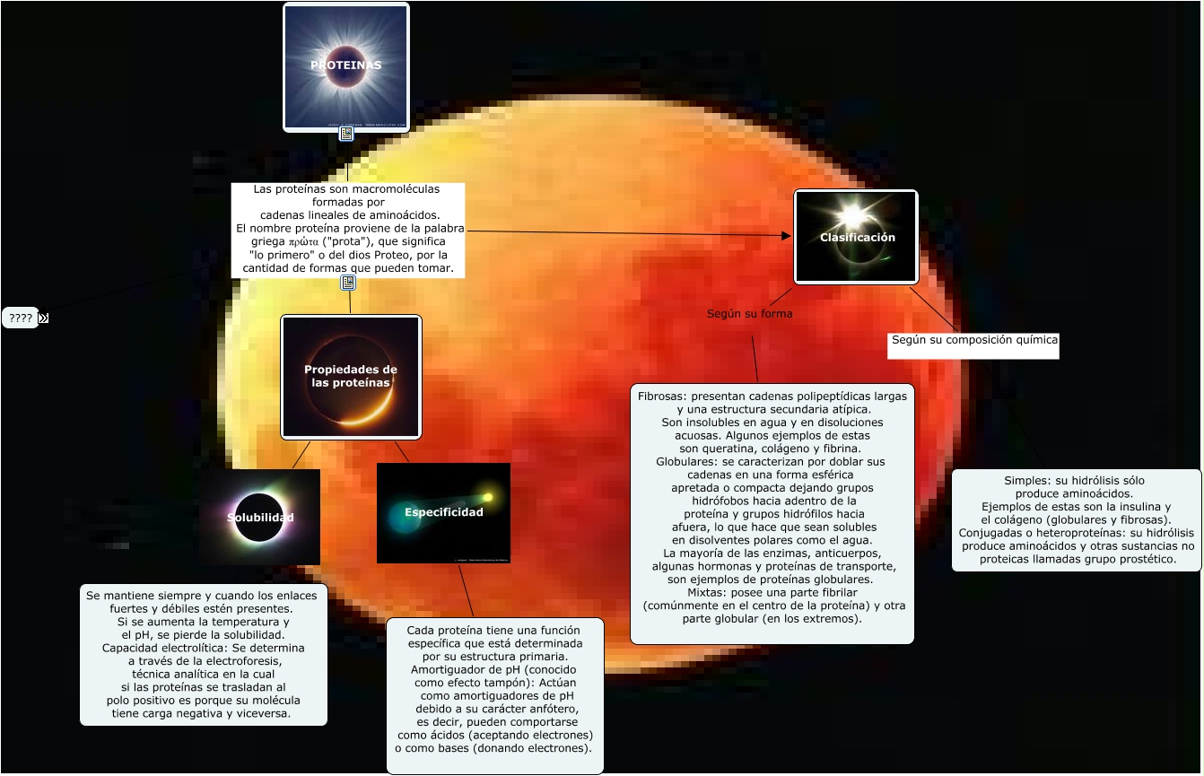 Este Cmap, tiene información relacionada con: PROTEINAS, CARACTERISTICAS Las proteínas son macromoléculas; son biopolímeros, es decir, están constituidas por gran número de unidades estructurales simples repetitivas (monómeros). Debido a su gran tamaño, cuando estas moléculas se dispersan en un disolvente adecuado, forman siempre dispersiones coloidales, con características que las diferencian de las disoluciones de moléculas más pequeñas. Por hidrólisis, las moléculas de proteína se escinden en numerosos compuestos relativamente simples, de masa pequeña, que son las unidades fundamentales constituyentes de la macromolécula . Estas unidades son los aminoácidos, de los cuales existen veinte especies diferentes y que se unen entre sí mediante enlaces peptídicos. Cientos y miles de estos aminoácidos pueden participar en la formación de la gran molécula polimérica de una proteína., Propiedades de las proteínas Especificidad Cada proteína tiene una función específica que está determinada por su estructura primaria. Amortiguador de pH (conocido como efecto tampón): Actúan como amortiguadores de pH debido a su carácter anfótero, es decir, pueden comportarse como ácidos (aceptando electrones) o como bases (donando electrones)., PROTEINAS Las proteínas son macromoléculas formadas por cadenas lineales de aminoácidos. El nombre proteína proviene de la palabra griega π�?ώτα ("prota"), que significa "lo primero" o del dios Proteo, por la cantidad de formas que pueden tomar. Propiedades de las proteínas, PROTEINAS Las proteínas son macromoléculas formadas por cadenas lineales de aminoácidos. El nombre proteína proviene de la palabra griega π�?ώτα ("prota"), que significa "lo primero" o del dios Proteo, por la cantidad de formas que pueden tomar. Clasificación, Clasificación Según su forma Fibrosas: presentan cadenas polipeptídicas largas y una estructura secundaria atípica. Son insolubles en agua y en disoluciones acuosas. Algunos ejemplos de estas son queratina, colágeno y fibrina. Globulares: se caracterizan por doblar sus cadenas en una forma esférica apretada o compacta dejando grupos hidrófobos hacia adentro de la proteína y grupos hidrófilos hacia afuera, lo que hace que sean solubles en disolventes polares como el agua. La mayoría de las enzimas, anticuerpos, algunas hormonas y proteínas de transporte, son ejemplos de proteínas globulares. Mixtas: posee una parte fibrilar (comúnmente en el centro de la proteína) y otra parte globular (en los extremos)., PROTEINAS Las proteínas son macromoléculas formadas por cadenas lineales de aminoácidos. El nombre proteína proviene de la palabra griega π�?ώτα ("prota"), que significa "lo primero" o del dios Proteo, por la cantidad de formas que pueden tomar. CARACTERISTICAS, Clasificación Según su composición química Simples: su hidrólisis sólo produce aminoácidos. Ejemplos de estas son la insulina y el colágeno (globulares y fibrosas). Conjugadas o heteroproteínas: su hidrólisis produce aminoácidos y otras sustancias no proteicas llamadas grupo prostético., Por hidrólisis, las moléculas de proteína se escinden en numerosos compuestos relativamente simples, de masa pequeña, que son las unidades fundamentales constituyentes de la macromolécula . Estas unidades son los aminoácidos, de los cuales existen veinte especies diferentes y que se unen entre sí mediante enlaces peptídicos. Cientos y miles de estos aminoácidos pueden participar en la formación de la gran molécula polimérica de una proteína. Todas las proteínas tienen carbono, hidrógeno, oxígeno y nitrógeno y casi todas poseen también azufre. Si bien hay ligeras variaciones en diferentes proteínas, el contenido de nitrógeno representa, por término medio, 16% de la masa total de la molécula; es decir, cada 6,25 g de proteína contienen 1 g de N. El factor 6,25 se utiliza para estimar la cantidad de proteína existente en una muestra a partir de la medición de N de la misma. La síntesis proteica es un proceso complejo cumplido por las células según las directrices de la información suministrada por los genes., Propiedades de las proteínas Solubilidad Se mantiene siempre y cuando los enlaces fuertes y débiles estén presentes. Si se aumenta la temperatura y el pH, se pierde la solubilidad. Capacidad electrolítica: Se determina a través de la electroforesis, técnica analítica en la cual si las proteínas se trasladan al polo positivo es porque su molécula tiene carga negativa y viceversa.