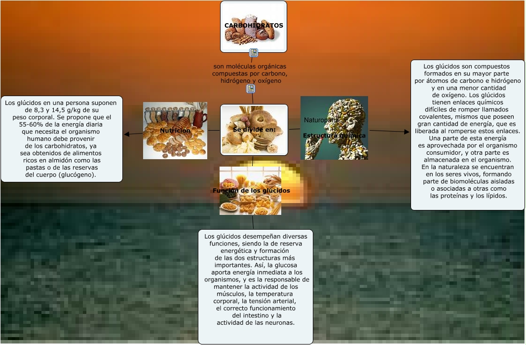 Este Cmap, tiene información relacionada con: carbohidratos4, Se divide en: Función de los glúcidos Los glúcidos desempeñan diversas funciones, siendo la de reserva energética y formación de las dos estructuras más importantes. Así, la glucosa aporta energía inmediata a los organismos, y es la responsable de mantener la actividad de los músculos, la temperatura corporal, la tensión arterial, el correcto funcionamiento del intestino y la actividad de las neuronas., Se divide en: Nutricion Los glúcidos en una persona suponen de 8,3 y 14,5 g/kg de su peso corporal. Se propone que el 55-60% de la energía diaria que necesita el organismo humano debe provenir de los carbohidratos, ya sea obtenidos de alimentos ricos en almidón como las pastas o de las reservas del cuerpo (glucógeno)., Se divide en: Estructura química Los glúcidos son compuestos formados en su mayor parte por átomos de carbono e hidrógeno y en una menor cantidad de oxígeno. Los glúcidos tienen enlaces químicos difíciles de romper llamados covalentes, mismos que poseen gran cantidad de energía, que es liberada al romperse estos enlaces. Una parte de esta energía es aprovechada por el organismo consumidor, y otra parte es almacenada en el organismo. En la naturaleza se encuentran en los seres vivos, formando parte de biomoléculas aisladas o asociadas a otras como las proteínas y los lípidos., CARBOHIDRATOS son moléculas orgánicas compuestas por carbono, hidrógeno y oxígeno Se divide en: