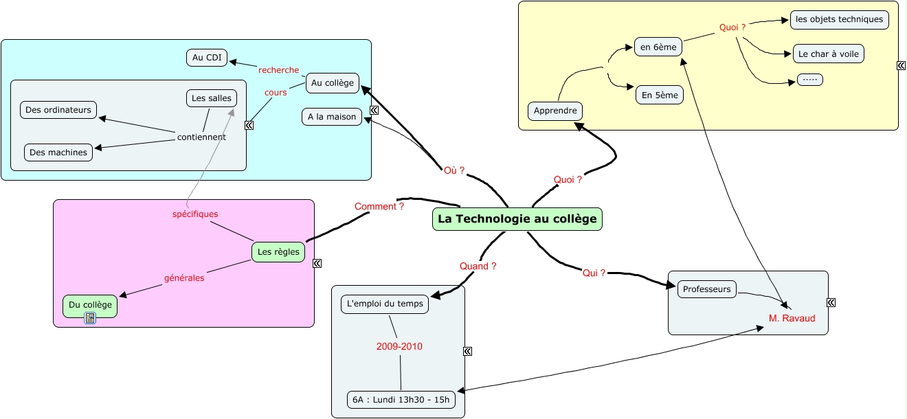 Cette carte de concepts créée avec IHMC CmapTools traite de: La technologie au collège, Apprendre en 6ème, Professeurs M. Ravaud en 6ème, Au collège recherche Au CDI, La Technologie au collège Comment ? Les règles, en 6ème Quoi ? ....., Les règles générales Du collège, La Technologie au collège Où ? Au collège, La Technologie au collège Qui ? Professeurs, L'emploi du temps 2009-2010 6A : Lundi 13h30 - 15h, en 6ème Quoi ? Le char à voile, Les règles spécifiques Les salles, Les salles contiennent Des machines, La Technologie au collège Quoi ? Apprendre, en 6ème Quoi ? les objets techniques, La Technologie au collège Où ? A la maison, La Technologie au collège Quand ? L'emploi du temps, Au collège cours Les salles de technologie, Professeurs M. Ravaud 6A : Lundi 13h30 - 15h, Les salles contiennent Des ordinateurs, Apprendre En 5ème