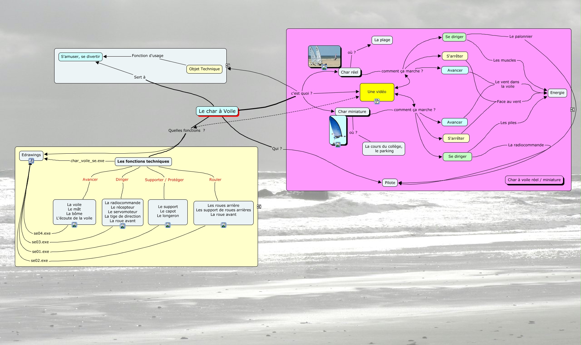 Cette carte de concepts créée avec IHMC CmapTools traite de: etude_char_voile, Une vidéo comment ça marche ? S'arrêter, Les roues arrière Les support de roues arrières La roue avant se02.exe Edrawings, Char réel comment ça marche ? Une vidéo, Char miniature comment ça marche ? S'arrêter, S'arrêter Face au vent Energie, Se diriger Le palonnier Pilote, Se diriger Les muscles Energie, Une vidéo comment ça marche ? Se diriger, Le char à Voile Qui ? Pilote, Les fonctions techniques Rouler Les roues arrière Les support de roues arrières La roue avant, Les fonctions techniques Diriger La radiocommande Le récepteur Le servomoteur La tige de direction La roue avant, Le char à Voile Quelles fonctions ? Les fonctions techniques, Char miniature comment ça marche ? Se diriger, S'arrêter Face au vent Energie, Avancer Le vent dans la voile Avancer, Le char à Voile c'est quoi ? Une vidéo, Char réel comment ça marche ? S'arrêter, Les fonctions techniques char_voile_se.exe Edrawings, Le support Le capot Le longeron se01.exe Edrawings, La radiocommande Le récepteur Le servomoteur La tige de direction La roue avant se03.exe Edrawings