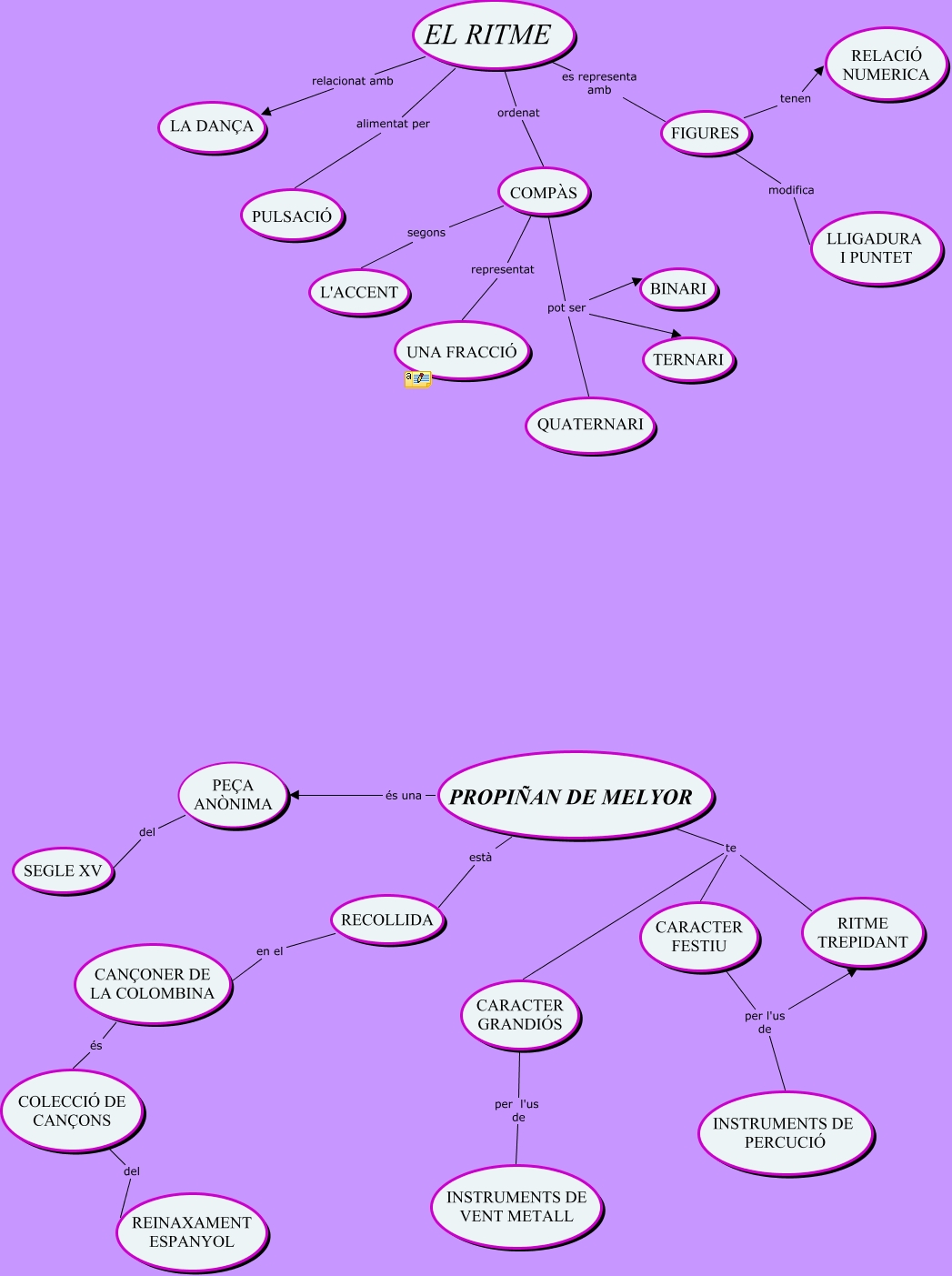 Este Cmap, tiene información relacionada con: T-1, COMPÀS pot ser BINARI, CANÇONER DE LA COLOMBINA és COLECCIÓ DE CANÇONS, COMPÀS pot ser TERNARI, RECOLLIDA en el CANÇONER DE LA COLOMBINA, CARACTER FESTIU per l'us de RITME TREPIDANT, PROPIÑAN DE MELYOR està RECOLLIDA, PROPIÑAN DE MELYOR te RITME TREPIDANT, EL RITME ordenat COMPÀS, EL RITME es representa amb FIGURES, COMPÀS pot ser QUATERNARI, EL RITME alimentat per PULSACIÓ, CARACTER GRANDIÓS per l'us de INSTRUMENTS DE VENT METALL, PROPIÑAN DE MELYOR te CARACTER GRANDIÓS, COMPÀS representat UNA FRACCIÓ, PROPIÑAN DE MELYOR és una PEÇA ANÒNIMA, CARACTER FESTIU per l'us de INSTRUMENTS DE PERCUCIÓ, FIGURES tenen RELACIÓ NUMERICA, COMPÀS segons L'ACCENT, PEÇA ANÒNIMA del SEGLE XV, COLECCIÓ DE CANÇONS del REINAXAMENT ESPANYOL