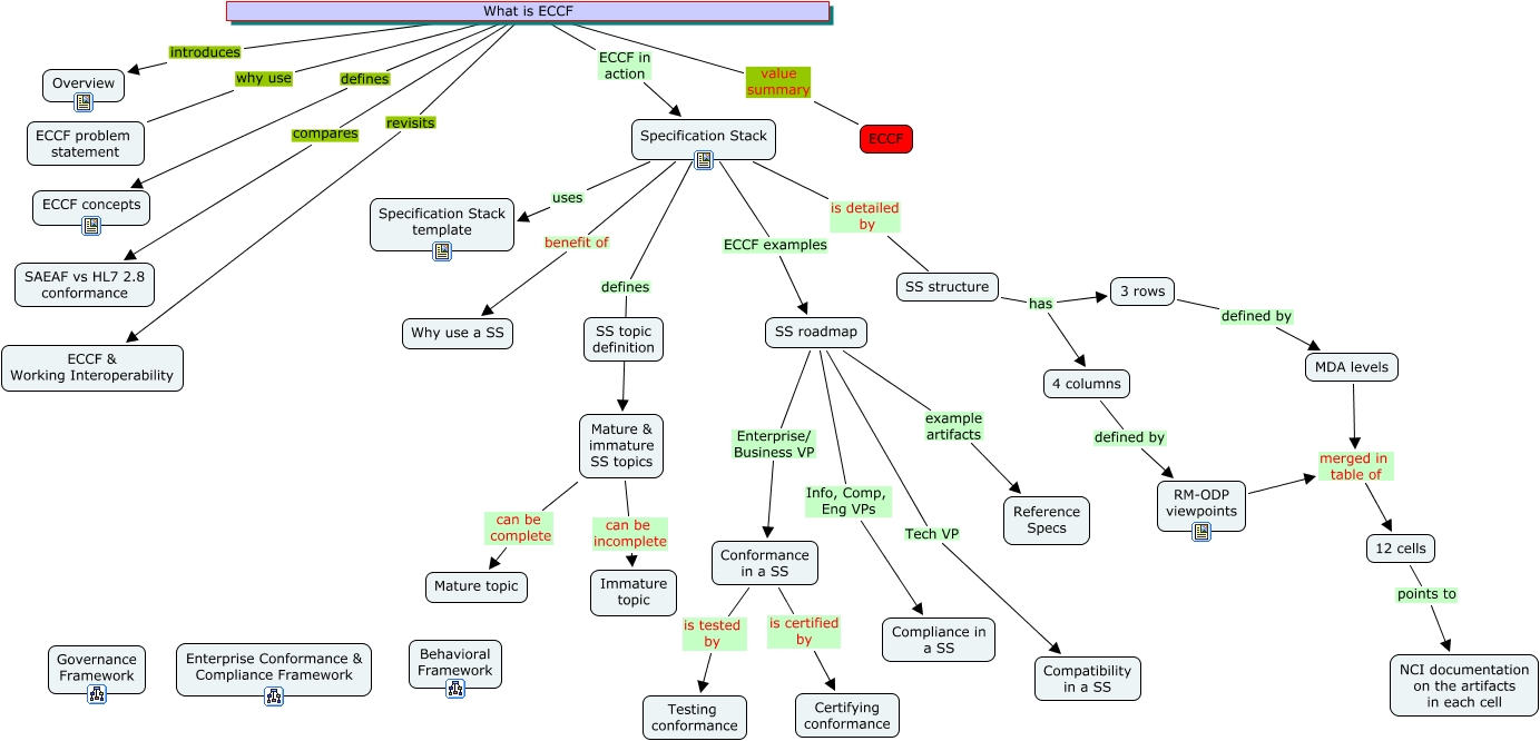 This Concept Map, created with IHMC CmapTools, has information related to: SAEAF ECCF - cliff predicate changes Cmap, What is ECCF why use ECCF problem statement, Specification Stack defines Mature & immature SS topics, What is ECCF value summary ECCF, SS structure has 3 rows, SS roadmap Tech VP Compatibility in a SS, Mature & immature SS topics can be complete Mature topic, Specification Stack ECCF examples SS roadmap, What is ECCF compares SAEAF vs HL7 2.8 conformance, MDA levels merged in table of 12 cells, RM-ODP viewpoints merged in table of 12 cells, Conformance in a SS is certified by Certifying conformance, Mature & immature SS topics can be incomplete Immature topic, Specification Stack is detailed by SS structure, SS roadmap example artifacts Reference Specs, What is ECCF defines ECCF concepts, Conformance in a SS is tested by Testing conformance, 3 rows defined by MDA levels, What is ECCF introduces Overview, SS roadmap Info, Comp, Eng VPs Compliance in a SS, Specification Stack benefit of Why use a SS