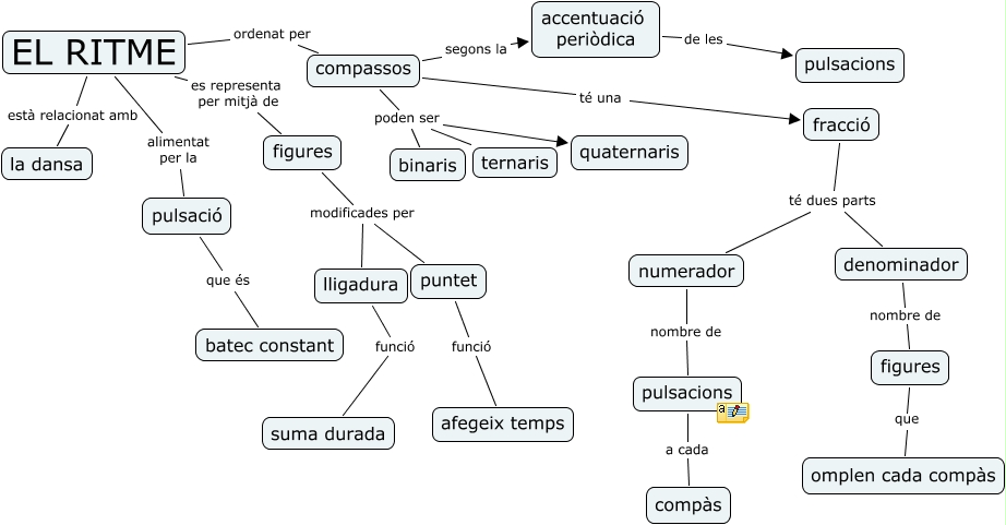 Este Cmap, tiene información relacionada con: Unitat 1, puntet funció afegeix temps, compassos té una fracció, pulsacions a cada compàs, EL RITME ordenat per compassos, denominador nombre de figures, numerador nombre de pulsacions, EL RITME alimentat per la pulsació, figures modificades per lligadura, compassos segons la accentuació periòdica, compassos poden ser ternaris, fracció té dues parts denominador, compassos poden ser binaris, compassos poden ser quaternaris, EL RITME està relacionat amb la dansa, EL RITME es representa per mitjà de figures, pulsació que és batec constant, figures modificades per puntet, lligadura funció suma durada, accentuació periòdica de les pulsacions, figures que omplen cada compàs