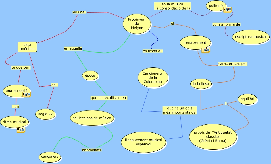 Este Cmap, tiene información relacionada con: propinyan de melior, Propinyan de Melyor es troba al Cancionero de la Colombina, peça anónima del segle xv, Propinyan de Melyor en aquella època, peça anónima te que teni una pulsació, Propinyan de Melyor el renaixement, una pulsació i un ritme musical, Propinyan de Melyor es una peça anónima, època que es recollissin en col.leccions de música