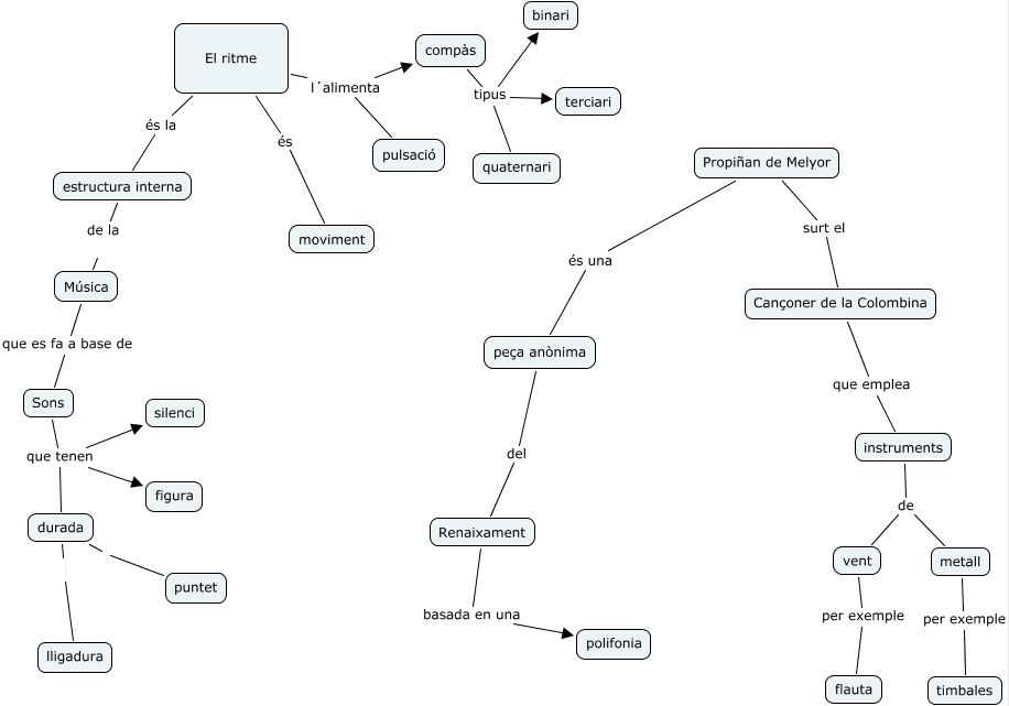 Este Cmap, tiene información relacionada con: el ritme, El ritme és moviment, durada lligadura, instruments de metall, El ritme és la estructura interna, Propiñan de Melyor surt el Cançoner de la Colombina, Renaixament basada en una polifonia, compàs tipus quaternari, durada puntet, metall per exemple timbales, Música que es fa a base de Sons, estructura interna de la Música, El ritme l´alimenta pulsació, instruments de vent, El ritme l´alimenta compàs, peça anònima del Renaixament, Sons que tenen silenci, compàs tipus binari, Sons que tenen durada, compàs tipus terciari, Sons que tenen figura