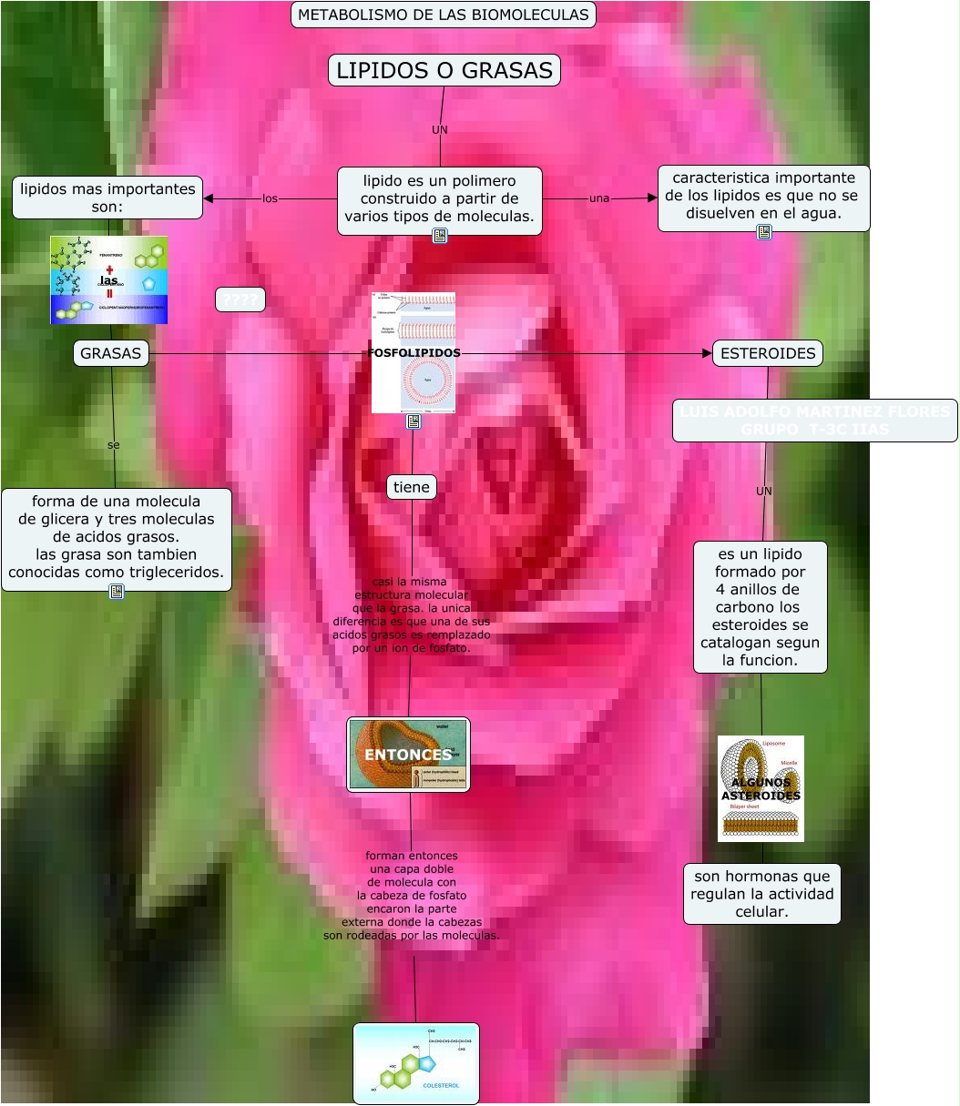 Este Cmap, tiene información relacionada con: grasas, ESTEROIDES UN es un lipido formado por 4 anillos de carbono los esteroides se catalogan segun la funcion., GRASAS FOSFOLIPIDOS ESTEROIDES, lipido es un polimero construido a partir de varios tipos de moleculas. los lipidos mas importantes son:, tiene casi la misma estructura molecular que la grasa. la unica diferencia es que una de sus acidos grasos es remplazado por un ion de fosfato. ENTONCES, lipidos mas importantes son: las GRASAS, es un lipido formado por 4 anillos de carbono los esteroides se catalogan segun la funcion. ALGUNOS ASTEROIDES son hormonas que regulan la actividad celular., LIPIDOS O GRASAS UN lipido es un polimero construido a partir de varios tipos de moleculas., ENTONCES forman entonces una capa doble de molecula con la cabeza de fosfato encaron la parte externa donde la cabezas son rodeadas por las moleculas., GRASAS FOSFOLIPIDOS tiene, GRASAS se forma de una molecula de glicera y tres moleculas de acidos grasos. las grasa son tambien conocidas como trigleceridos., lipido es un polimero construido a partir de varios tipos de moleculas. una caracteristica importante de los lipidos es que no se disuelven en el agua.