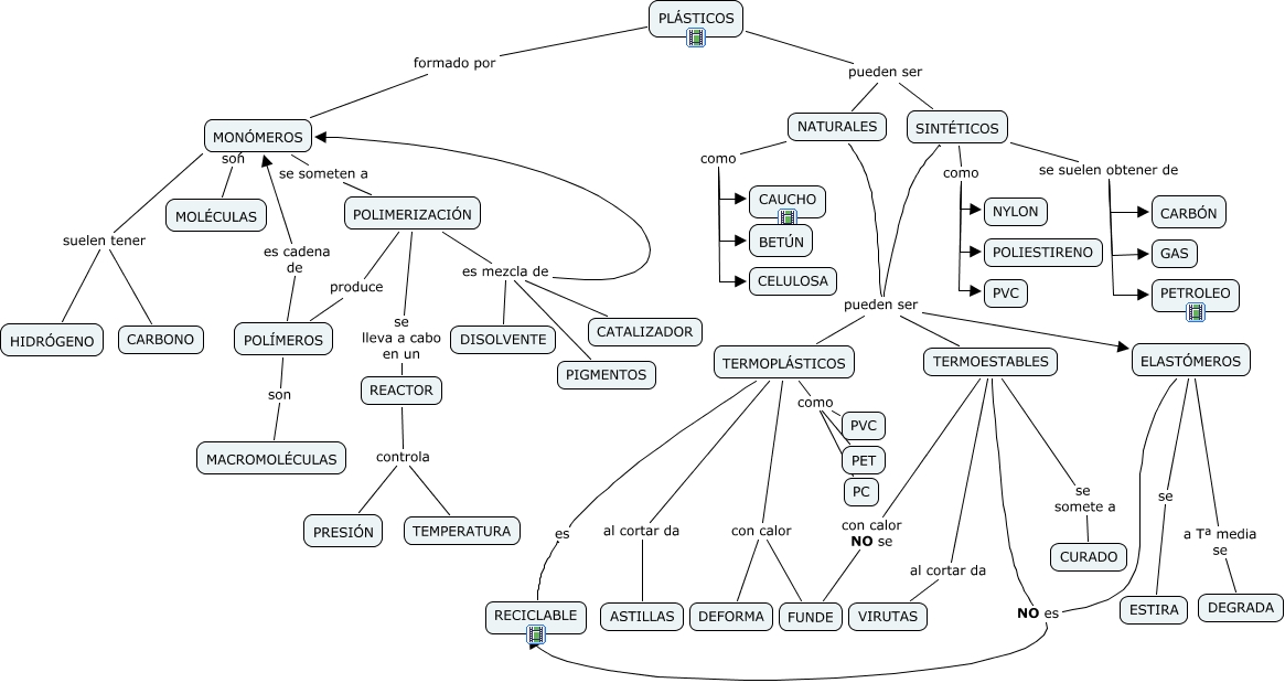 Este Cmap, tiene información relacionada con: 3ESO-Plasticos_03, REACTOR controla TEMPERATURA, SINTÉTICOS se suelen obtener de GAS, MONÓMEROS suelen tener HIDRÓGENO, TERMOESTABLES al cortar da VIRUTAS, POLIMERIZACIÓN es mezcla de CATALIZADOR, NATURALES como CELULOSA, PLÁSTICOS pueden ser SINTÉTICOS, TERMOPLÁSTICOS como PC, MONÓMEROS son MOLÉCULAS, MONÓMEROS suelen tener CARBONO, TERMOPLÁSTICOS con calor FUNDE, MONÓMEROS se someten a POLIMERIZACIÓN, POLIMERIZACIÓN es mezcla de MONÓMEROS, SINTÉTICOS como NYLON, TERMOESTABLES NO es RECICLABLE, POLIMERIZACIÓN es mezcla de DISOLVENTE, TERMOESTABLES se somete a CURADO, NATURALES pueden ser TERMOPLÁSTICOS, TERMOPLÁSTICOS con calor DEFORMA, SINTÉTICOS como PVC