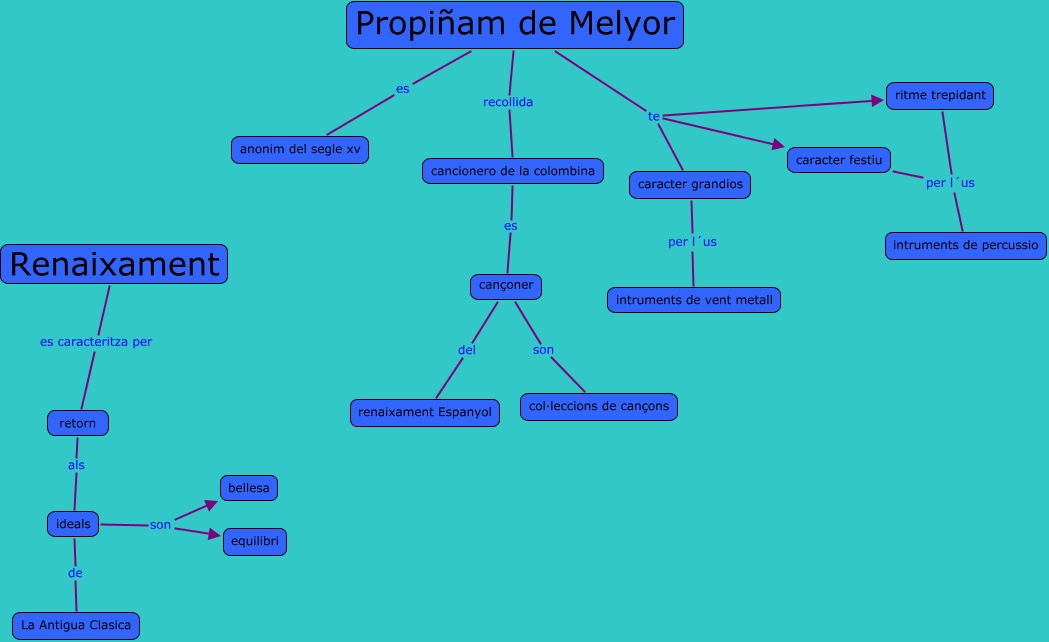Este Cmap, tiene información relacionada con: propiñam de melyor, Propiñam de Melyor te ritme trepidant, ritme trepidant per l´us intruments de percussio, cancionero de la colombina es cançoner, ideals de La Antigua Clasica, ideals son equilibri, caracter grandios per l´us intruments de vent metall, Renaixament es caracteritza per retorn, Propiñam de Melyor te caracter grandios, cançoner del renaixament Espanyol, Propiñam de Melyor es anonim del segle xv, Propiñam de Melyor recollida cancionero de la colombina, ideals son bellesa, caracter festiu per l´us intruments de percussio, Propiñam de Melyor te caracter festiu, retorn als ideals, cançoner son col·leccions de cançons