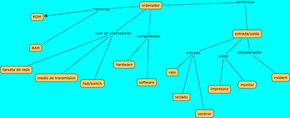 Este Cmap, tiene información relacionada con: esquema de ordenador, ordenador memorias RAM, ordenador perifericos entrada/saída, ordenador rede de ordenadores tarxeta de rede, entrada/saída entrada escáner, ordenador compoñentes hardware, entrada/saída entrada rato, ordenador rede de ordenadores medio de transmisíon, ordenador memorias ROM, entrada/saída saída monitor, entrada/saída entrada teclado, ordenador compoñentes software, entrada/saída entrada/saída módem, ordenador rede de ordenadores hub/switch, entrada/saída saída impresora