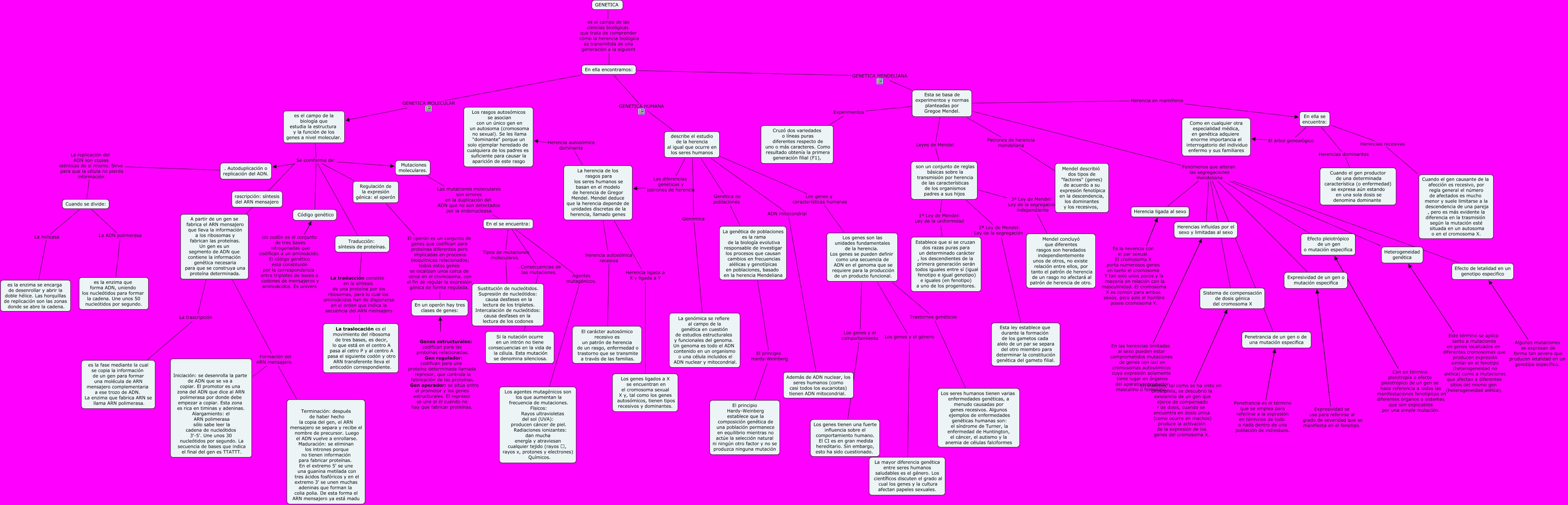 Este Cmap, tiene información relacionada con: RECUPERACION 1PERIODO, Esta se basa de experimentos y normas planteadas por Gregoe Mendel. Fenómenos que alteran las segregaciones mendeliana Penetrancia de un gen o de una mutación especifica, Traducción: síntesis de proteínas. La traducción consiste en la síntesis de una proteína por los ribosomas, para lo cual los aminoácidos han de disponerse en el orden que indica la secuencia del ARN mensajero La traslocación es el movimiento del ribosoma de tres bases, es decir, lo que está en el centro A pasa al cetro P y al centro A pasa el siguiente codón y otro ARN transferente lleva el anticodón correspondiente., son un conjunto de reglas básicas sobre la transmisión por herencia de las características de los organismos padres a sus hijos 1ª Ley de Mendel: Ley de la uniformidad Establece que si se cruzan dos razas puras para un determinado carácter , los descendientes de la primera generación serán todos iguales entre sí (igual fenotipo e igual genotipo) e iguales (en fenotipo) a uno de los progenitores., describe el estudio de la herencia al igual que ocurre en los seres humanos Genómica La genómica se refiere al campo de la genética en cuestión de estudios estructurales y funcionales del genoma. Un genoma es todo el ADN contenido en un organismo o una célula incluidos el ADN nuclear y mitocondrial., describe el estudio de la herencia al igual que ocurre en los seres humanos Las diferencias genéticas y patrones de herencia La herencia de los rasgos para los seres humanos se basan en el modelo de herencia de Gregor Mendel. Mendel deduce que la herencia depende de unidades discretas de la herencia, llamado genes, Esta se basa de experimentos y normas planteadas por Gregoe Mendel. Leyes de Mendel son un conjunto de reglas básicas sobre la transmisión por herencia de las características de los organismos padres a sus hijos, A partir de un gen se fabrica el ARN mensajero que lleva la información a los ribosomas y fabrican las proteínas. Un gen es un segmento de ADN que contiene la información genética necesaria para que se construya una proteína determinada. Formación del ARN mensajero. Terminación: después de haber hecho la copia del gen, el ARN mensajero se separa y recibe el nombre de precursor. Luego el ADN vuelve a enrollarse. Maduración: se eliminan los intrones porque no tienen información para fabricar proteínas. En el extremo 5' se une una guanina metilada con tres ácidos fosfóricos y en el extremo 3' se unen muchas adeninas que forman la colia polia. De esta forma el ARN mensajero ya está madu, describe el estudio de la herencia al igual que ocurre en los seres humanos ADN mitocondrial Además de ADN nuclear, los seres humanos (como casi todos los eucariotas) tienen ADN mitocondrial., es el campo de la biología que estudia la estructura y la función de los genes a nivel molecular. Se comforma de: Mutaciones moleculares., Esta se basa de experimentos y normas planteadas por Gregoe Mendel. Fenómenos que alteran las segregaciones mendeliana Expresividad de un gen o mutación especifica, La herencia de los rasgos para los seres humanos se basan en el modelo de herencia de Gregor Mendel. Mendel deduce que la herencia depende de unidades discretas de la herencia, llamado genes Herencia autosómica recesiva El carácter autosómico recesivo es un patrón de herencia de un rasgo, enfermedad o trastorno que se transmite a través de las familias., Los genes son las unidades fundamentales de la herencia. Los genes se pueden definir como una secuencia de ADN en el genoma que se requiere para la producción de un producto funcional. Los genes y el género La mayor diferencia genética entre seres humanos saludables es el género. Los científicos discuten el grado al cual los genes y la cultura afectan papeles sexuales., En el se encuentra: Tipos de mutaciones moleculares. Sustitución de nucleótidos. Supresión de nucleótidos: causa desfases en la lectura de los tripletes. Intercalación de nucleótidos: causa desfases en la lectura de los codones, Esta se basa de experimentos y normas planteadas por Gregoe Mendel. Herencia en mamíferos En ella se encuentra:, Esta se basa de experimentos y normas planteadas por Gregoe Mendel. Patrones de herencia mendeliana Mendel describió dos tipos de "factores" (genes) de acuerdo a su expresión fenotípica en la descendencia, los dominantes y los recesivos,, es el campo de la biología que estudia la estructura y la función de los genes a nivel molecular. Se comforma de: A partir de un gen se fabrica el ARN mensajero que lleva la información a los ribosomas y fabrican las proteínas. Un gen es un segmento de ADN que contiene la información genética necesaria para que se construya una proteína determinada., Los genes son las unidades fundamentales de la herencia. Los genes se pueden definir como una secuencia de ADN en el genoma que se requiere para la producción de un producto funcional. Trastornos genéticos Los seres humanos tienen varias enfermedades genéticas, a menudo causadas por genes recesivos. Algunos ejemplos de enfermedades genéticas humanas son: el síndrome de Turner, la enfermedad de Huntington, el cáncer, el autismo y la anemia de células falciformes, Regulación de la expresión génica: el operón El operón es un conjunto de genes que codifican para proteínas diferentes pero implicadas en procesos bioquímicos relacionados; todos estos genes se localizan unos cerca de otros en el cromosoma, con el fin de regular la expresión génica de forma regulada. En un operón hay tres clases de genes:, En ella encontramos: GENETICA MOLECULAR es el campo de la biología que estudia la estructura y la función de los genes a nivel molecular., son un conjunto de reglas básicas sobre la transmisión por herencia de las características de los organismos padres a sus hijos 3ª Ley de Mendel: Ley de la segregación independiente Mendel concluyó que 