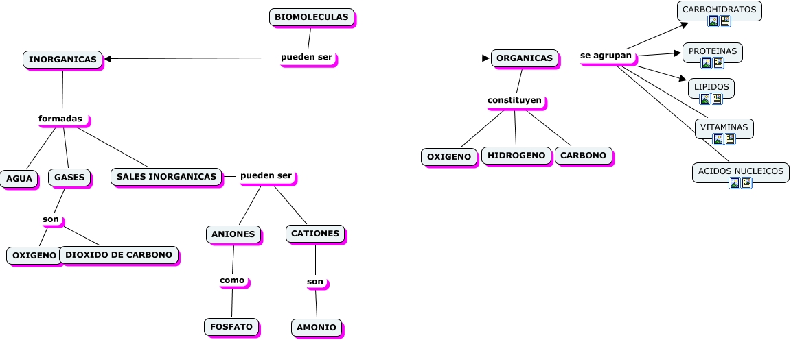 Este Cmap, tiene información relacionada con: biomoleculas-nadiuska gamez 11 d, ORGANICAS constituyen CARBONO, ORGANICAS se agrupan VITAMINAS, GASES son DIOXIDO DE CARBONO, INORGANICAS formadas AGUA, SALES INORGANICAS pueden ser ANIONES, ORGANICAS se agrupan LIPIDOS, ANIONES como FOSFATO, SALES INORGANICAS pueden ser CATIONES, BIOMOLECULAS pueden ser INORGANICAS, GASES son OXIGENO, ORGANICAS constituyen OXIGENO, INORGANICAS formadas SALES INORGANICAS, ORGANICAS se agrupan PROTEINAS, INORGANICAS formadas GASES, CATIONES son AMONIO, ORGANICAS constituyen HIDROGENO, ORGANICAS se agrupan CARBOHIDRATOS, BIOMOLECULAS pueden ser ORGANICAS, ORGANICAS se agrupan ACIDOS NUCLEICOS