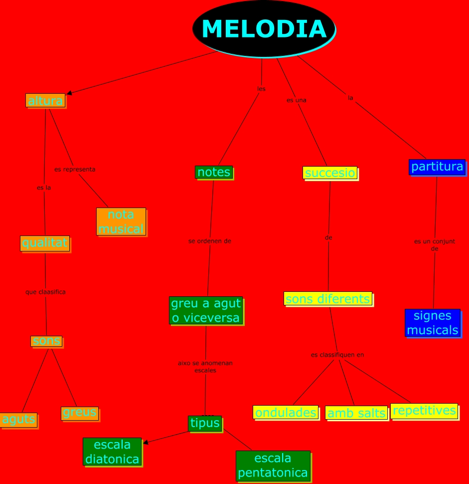 Este Cmap, tiene información relacionada con: MELODIA, altura es representa nota musical, MELODIA la partitura, succesio de sons diferents, sons diferents es classifiquen en repetitives, sons diferents es classifiquen en amb salts, sons diferents es classifiquen en ondulades, partitura es un conjunt de signes musicals, MELODIA les notes, qualitat que claasifica sons, sons ???? aguts, altura es la qualitat, greu a agut o viceversa aixo se anomenan escales tipus, MELODIA ???? altura, tipus ???? escala diatonica, MELODIA es una succesio, notes se ordenen de greu a agut o viceversa, tipus ???? escala pentatonica, sons ???? greus