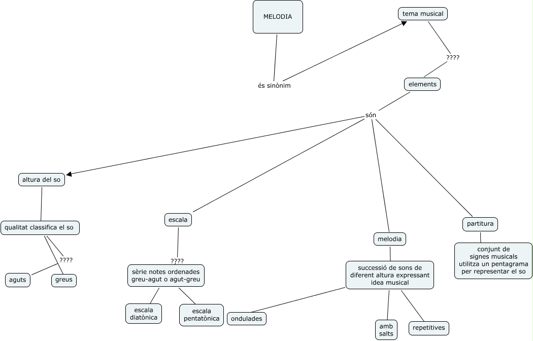Este Cmap, tiene información relacionada con: Tema 2 - La Melodia, sèrie notes ordenades greu-agut o agut-greu ???? escala pentatònica, escala ???? sèrie notes ordenades greu-agut o agut-greu, elements són altura del so, tema musical ???? elements, successió de sons de diferent altura expressant idea musical ???? repetitives, sèrie notes ordenades greu-agut o agut-greu ???? escala diatònica, successió de sons de diferent altura expressant idea musical ???? amb salts, elements són melodia, successió de sons de diferent altura expressant idea musical ???? ondulades, melodia ???? successió de sons de diferent altura expressant idea musical, altura del so ???? qualitat classifica el so, MELODIA és sinònim tema musical, qualitat classifica el so ???? aguts, qualitat classifica el so ???? greus, elements són escala, partitura ???? conjunt de signes musicals utilitza un pentagrama per representar el so, elements són partitura