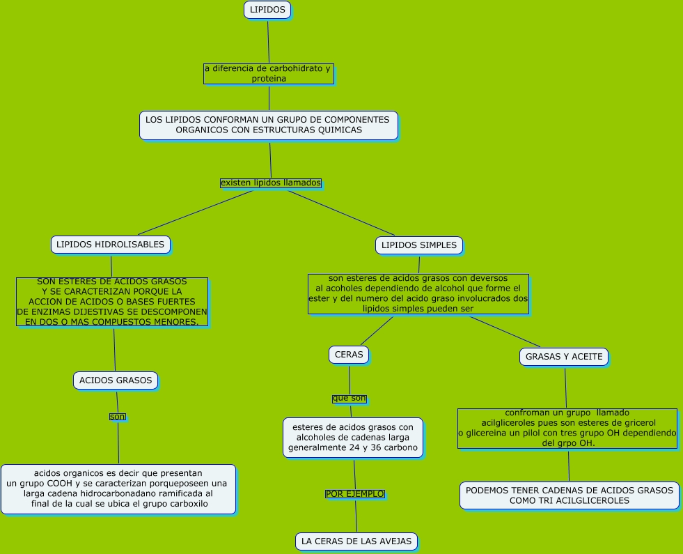 Este Cmap, tiene información relacionada con: brigite LIPIDO.cmap, LIPIDOS HIDROLISABLES SON ESTERES DE ACIDOS GRASOS Y SE CARACTERIZAN PORQUE LA ACCION DE ACIDOS O BASES FUERTES DE ENZIMAS DIJESTIVAS SE DESCOMPONEN EN DOS O MAS COMPUESTOS MENORES. ACIDOS GRASOS, LOS LIPIDOS CONFORMAN UN GRUPO DE COMPONENTES ORGANICOS CON ESTRUCTURAS QUIMICAS existen lipidos llamados LIPIDOS HIDROLISABLES, LIPIDOS SIMPLES son esteres de acidos grasos con deversos al acoholes dependiendo de alcohol que forme el ester y del numero del acido graso involucrados dos lipidos simples pueden ser CERAS, CERAS que son esteres de acidos grasos con alcoholes de cadenas larga generalmente 24 y 36 carbono, LIPIDOS SIMPLES son esteres de acidos grasos con deversos al acoholes dependiendo de alcohol que forme el ester y del numero del acido graso involucrados dos lipidos simples pueden ser GRASAS Y ACEITE, ACIDOS GRASOS son acidos organicos es decir que presentan un grupo COOH y se caracterizan porqueposeen una larga cadena hidrocarbonadano ramificada al final de la cual se ubica el grupo carboxilo, LOS LIPIDOS CONFORMAN UN GRUPO DE COMPONENTES ORGANICOS CON ESTRUCTURAS QUIMICAS existen lipidos llamados LIPIDOS SIMPLES, GRASAS Y ACEITE confroman un grupo llamado acilgliceroles pues son esteres de gricerol o glicereina un pilol con tres grupo OH dependiendo del grpo OH. PODEMOS TENER CADENAS DE ACIDOS GRASOS COMO TRI ACILGLICEROLES, esteres de acidos grasos con alcoholes de cadenas larga generalmente 24 y 36 carbono POR EJEMPLO LA CERAS DE LAS AVEJAS, LIPIDOS a diferencia de carbohidrato y proteina LOS LIPIDOS CONFORMAN UN GRUPO DE COMPONENTES ORGANICOS CON ESTRUCTURAS QUIMICAS
