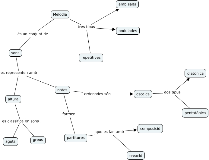 Este Cmap, tiene información relacionada con: la melodia, escales dos tipus diatònica, partitures que es fan amb creació, notes formen partitures, escales dos tipus pentatònica, Melodia tres tipus amb salts, Melodia tres tipus ondulades, Melodia és un conjunt de sons, altura es classifica en sons greus, altura es classifica en sons aguts, notes ordenades són escales, sons es representen amb notes, partitures que es fan amb composició, Melodia tres tipus repetitives, sons es representen amb altura