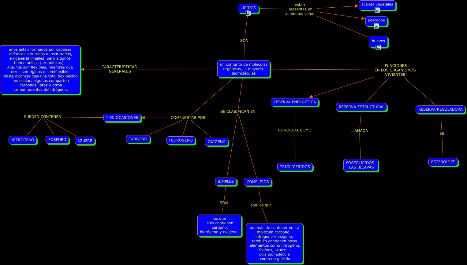 Este Cmap, tiene información relacionada con: LIPIDOS HERMES TERRAZA, Y EN OCASIONES PUEDEN CONTENER NITROGENO, un conjunto de moléculas orgánicas, la mayoría biomoléculas COMPUESTAS POR CARBONO, RESERVA ENERGETICA CONOCIDA COMO TRIGLICERIDOS, un conjunto de moléculas orgánicas, la mayoría biomoléculas SE CLASIFICAN EN COMPLEJOS, un conjunto de moléculas orgánicas, la mayoría biomoléculas CARACTERISTICAS GENERALES unos están formados por cadenas alifáticas saturadas o insaturadas, en general lineales, pero algunos tienen anillos (aromáticos). Algunos son flexibles, mientras que otros son rígidos o semiflexibles hasta alcanzar casi una total flexibilidad molecular; algunos comparten carbonos libres y otros forman puentes dehidrógeno., LIPIDOS SON un conjunto de moléculas orgánicas, la mayoría biomoléculas, LIPIDOS estan presentes en alimentos como huevos, RESERVA REGULADORA ES ESTEROIDES, COMPLEJOS son los que además de contener en su molécula carbono, hidrógeno y oxígeno, también contienen otros elementos como nitrógeno, fósforo, azufre u otra biomolécula como un glúcido, SIMPLES SON los que sólo contienen carbono, hidrógeno y oxígeno., LIPIDOS estan presentes en alimentos como pescados, un conjunto de moléculas orgánicas, la mayoría biomoléculas FUNCIONES EN LOS ORGANISMOS VIVIENTES RESERVA REGULADORA, Y EN OCASIONES PUEDEN CONTENER AZUFRE, Y EN OCASIONES PUEDEN CONTENER FOSFORO, LIPIDOS estan presentes en alimentos como aceites vegetales, un conjunto de moléculas orgánicas, la mayoría biomoléculas SE CLASIFICAN EN SIMPLES, un conjunto de moléculas orgánicas, la mayoría biomoléculas FUNCIONES EN LOS ORGANISMOS VIVIENTES RESERVA ESTRUCTURAL, un conjunto de moléculas orgánicas, la mayoría biomoléculas FUNCIONES EN LOS ORGANISMOS VIVIENTES RESERVA ENERGETICA, un conjunto de moléculas orgánicas, la mayoría biomoléculas COMPUESTAS POR OXIGENO, un conjunto de moléculas orgánicas, la mayoría biomoléculas COMPUESTAS POR Y EN OCASIONES