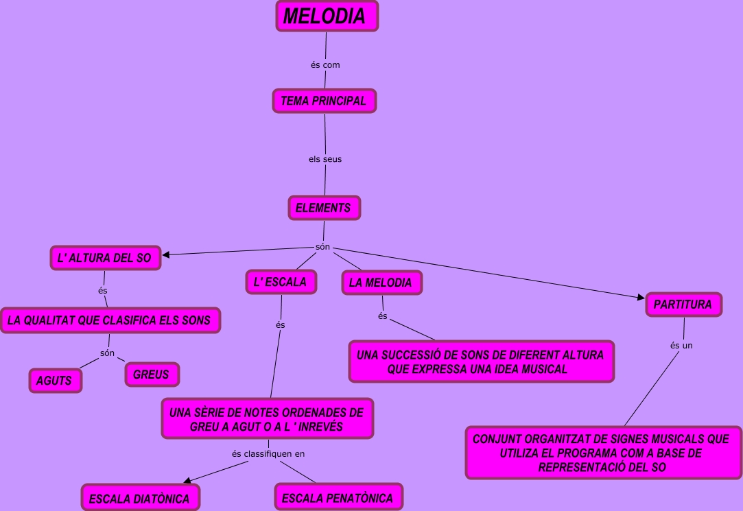 Este Cmap, tiene información relacionada con: UNITAT 2, TEMA PRINCIPAL els seus ELEMENTS, MELODIA és com TEMA PRINCIPAL, ELEMENTS són L' ALTURA DEL SO, LA QUALITAT QUE CLASIFICA ELS SONS són GREUS, UNA SÈRIE DE NOTES ORDENADES DE GREU A AGUT O A L ' INREVÉS és classifiquen en ESCALA PENATÒNICA, L' ALTURA DEL SO és LA QUALITAT QUE CLASIFICA ELS SONS, PARTITURA és un CONJUNT ORGANITZAT DE SIGNES MUSICALS QUE UTILIZA EL PROGRAMA COM A BASE DE REPRESENTACIÓ DEL SO, ELEMENTS són PARTITURA, LA QUALITAT QUE CLASIFICA ELS SONS són AGUTS, L' ESCALA és UNA SÈRIE DE NOTES ORDENADES DE GREU A AGUT O A L ' INREVÉS, UNA SÈRIE DE NOTES ORDENADES DE GREU A AGUT O A L ' INREVÉS és classifiquen en ESCALA DIATÒNICA, ELEMENTS són L' ESCALA, LA MELODIA és UNA SUCCESSIÓ DE SONS DE DIFERENT ALTURA QUE EXPRESSA UNA IDEA MUSICAL, ELEMENTS són LA MELODIA
