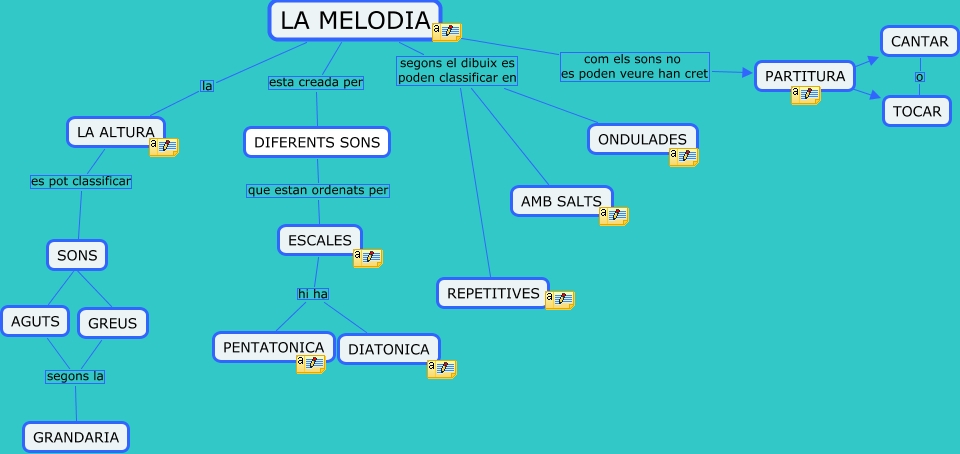 Este Cmap, tiene información relacionada con: UNITAT-2 (La melodia), LA MELODIA segons el dibuix es poden classificar en ONDULADES, LA MELODIA segons el dibuix es poden classificar en REPETITIVES, LA MELODIA la LA ALTURA, ESCALES hi ha PENTATONICA, LA MELODIA com els sons no es poden veure han cret PARTITURA, DIFERENTS SONS que estan ordenats per ESCALES, SONS ???? GREUS, LA MELODIA segons el dibuix es poden classificar en AMB SALTS, LA MELODIA esta creada per DIFERENTS SONS, ESCALES hi ha DIATONICA, CANTAR o TOCAR, SONS ???? AGUTS, LA ALTURA es pot classificar SONS, AGUTS segons la GRANDARIA, PARTITURA ???? TOCAR, GREUS segons la GRANDARIA, PARTITURA ???? CANTAR