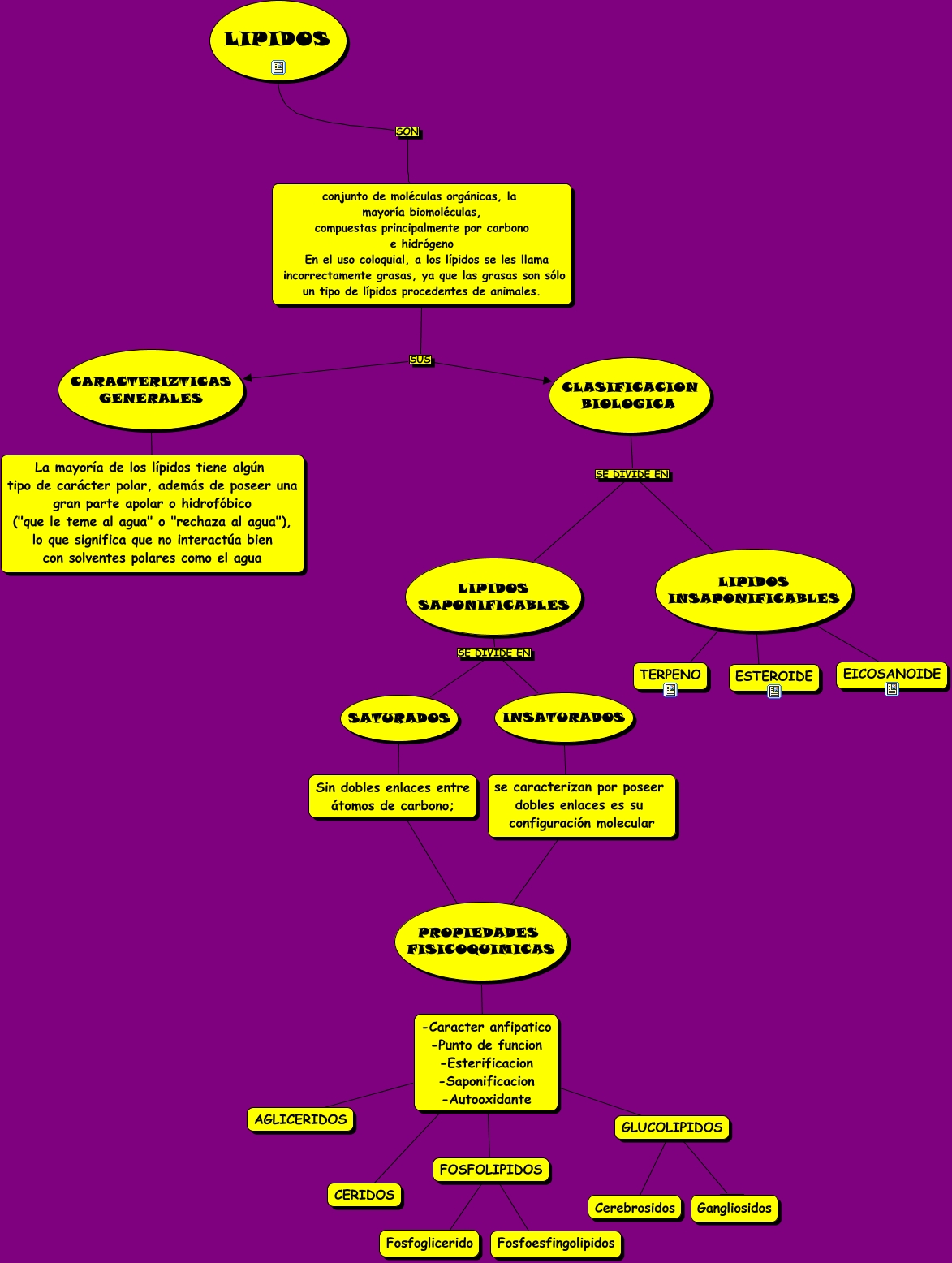 Este Cmap, tiene información relacionada con: lipidos raikari, conjunto de moléculas orgánicas, la mayoría biomoléculas, compuestas principalmente por carbono e hidrógeno En el uso coloquial, a los lípidos se les llama incorrectamente grasas, ya que las grasas son sólo un tipo de lípidos procedentes de animales. SUS CLASIFICACION BIOLOGICA, se caracterizan por poseer dobles enlaces es su configuración molecular ???? PROPIEDADES FISICOQUIMICAS, -Caracter anfipatico -Punto de funcion -Esterificacion -Saponificacion -Autooxidante ???? FOSFOLIPIDOS, Sin dobles enlaces entre átomos de carbono; ???? PROPIEDADES FISICOQUIMICAS, PROPIEDADES FISICOQUIMICAS ???? -Caracter anfipatico -Punto de funcion -Esterificacion -Saponificacion -Autooxidante, INSATURADOS ???? se caracterizan por poseer dobles enlaces es su configuración molecular, LIPIDOS SON conjunto de moléculas orgánicas, la mayoría biomoléculas, compuestas principalmente por carbono e hidrógeno En el uso coloquial, a los lípidos se les llama incorrectamente grasas, ya que las grasas son sólo un tipo de lípidos procedentes de animales., GLUCOLIPIDOS ???? Gangliosidos, -Caracter anfipatico -Punto de funcion -Esterificacion -Saponificacion -Autooxidante ???? CERIDOS, CARACTERIZTICAS GENERALES ???? La mayoría de los lípidos tiene algún tipo de carácter polar, además de poseer una gran parte apolar o hidrofóbico ("que le teme al agua" o "rechaza al agua"), lo que significa que no interactúa bien con solventes polares como el agua, LIPIDOS SAPONIFICABLES SE DIVIDE EN INSATURADOS, SATURADOS ???? Sin dobles enlaces entre átomos de carbono;, conjunto de moléculas orgánicas, la mayoría biomoléculas, compuestas principalmente por carbono e hidrógeno En el uso coloquial, a los lípidos se les llama incorrectamente grasas, ya que las grasas son sólo un tipo de lípidos procedentes de animales. SUS CARACTERIZTICAS GENERALES, LIPIDOS INSAPONIFICABLES ???? ESTEROIDE, -Caracter anfipatico -Punto de funcion -Esterificacion -Saponificacion -Autooxidante ???? AGLICERIDOS, FOSFOLIPIDOS ???? Fosfoglicerido, CLASIFICACION BIOLOGICA SE DIVIDE EN LIPIDOS INSAPONIFICABLES, LIPIDOS SAPONIFICABLES SE DIVIDE EN SATURADOS, CLASIFICACION BIOLOGICA SE DIVIDE EN LIPIDOS SAPONIFICABLES, FOSFOLIPIDOS ???? Fosfoesfingolipidos