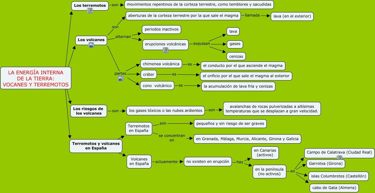 Este Cmap, tiene información relacionada con: La energía interna de la Tierra, volcanes y terremotos, los gases tóxicos o las nubes ardientes son avalanchas de rocas pulverizadas a altísimas temperaturas que se desplazan a gran velocidad., cráter es el orificio por el que sale el magma al exterior, en la península (no activos) en Campo de Calatrava (Ciudad Real), LA ENERGÍA INTERNA DE LA TIERRA: VOCANES Y TERREMOTOS ???? Los terremotos, chimenea volcánica es el conducto por el que asciende el magma, en la península (no activos) en Garrotxa (Girona), Terremotos y volcanes en España ???? Terremotos en España, en la península (no activos) en cabo de Gata (Almeria), LA ENERGÍA INTERNA DE LA TIERRA: VOCANES Y TERREMOTOS ???? Los riesgos de los volcanes, Terremotos y volcanes en España ???? Volcanes en España, aberturas de la corteza terrestre por la que sale el magma llamada lava (en el exterior), Los riesgos de los volcanes son los gases tóxicos o las nubes ardientes, Los volcanes partes cráter, Terremotos en España se concentran en en Granada, Málaga, Murcia, Alicante, Girona y Galicia, LA ENERGÍA INTERNA DE LA TIERRA: VOCANES Y TERREMOTOS ???? Los volcanes, Terremotos en España son pequeños y sin riesgo de ser graves, no existen en erupción hay en Canarias (activos), Volcanes en España actuamente no existen en erupción, Los volcanes alternan periodos inactivos, LA ENERGÍA INTERNA DE LA TIERRA: VOCANES Y TERREMOTOS ???? Terremotos y volcanes en España
