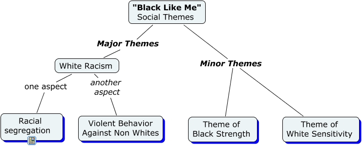 This Concept Map, created with IHMC CmapTools, has information related to: black like me, "Black Like Me" Social Themes Minor Themes Theme of White Sensitivity, "Black Like Me" Social Themes Minor Themes Theme of Black Strength, White Racism one aspect Racial segregation, White Racism another aspect Violent Behavior Against Non Whites, "Black Like Me" Social Themes Major Themes White Racism