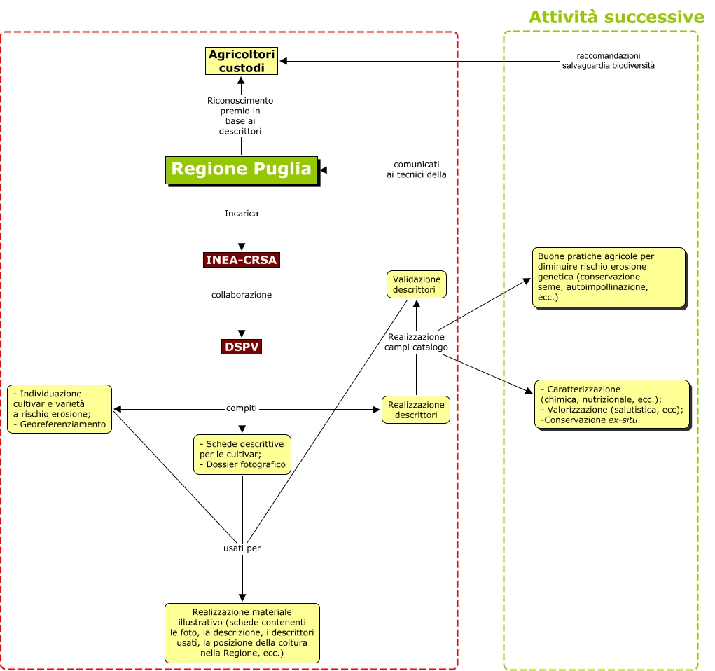 Questa Cmap, creata con IHMC CmapTools, contiene informazioni relative a: PSR, Validazione descrittori comunicati ai tecnici della Regione Puglia, INEA-CRSA collaborazione DSPV, Regione Puglia Incarica INEA-CRSA, DSPV compiti - Individuazione cultivar e varietà a rischio erosione; - Georeferenziamento, - Schede descrittive per le cultivar; - Dossier fotografico usati per Realizzazione materiale illustrativo (schede contenenti le foto, la descrizione, i descrittori usati, la posizione della coltura nella Regione, ecc.), DSPV compiti Realizzazione descrittori, Realizzazione descrittori Realizzazione campi catalogo Buone pratiche agricole per diminuire rischio erosione genetica (conservazione seme, autoimpollinazione, ecc.), Validazione descrittori usati per Realizzazione materiale illustrativo (schede contenenti le foto, la descrizione, i descrittori usati, la posizione della coltura nella Regione, ecc.), Buone pratiche agricole per diminuire rischio erosione genetica (conservazione seme, autoimpollinazione, ecc.) raccomandazioni salvaguardia biodiversità Agricoltori custodi, Realizzazione descrittori Realizzazione campi catalogo Validazione descrittori, Regione Puglia Riconoscimento premio in base ai descrittori Agricoltori custodi, - Individuazione cultivar e varietà a rischio erosione; - Georeferenziamento usati per Realizzazione materiale illustrativo (schede contenenti le foto, la descrizione, i descrittori usati, la posizione della coltura nella Regione, ecc.), DSPV compiti - Schede descrittive per le cultivar; - Dossier fotografico, Realizzazione descrittori Realizzazione campi catalogo - Caratterizzazione (chimica, nutrizionale, ecc.); - Valorizzazione (salutistica, ecc); -Conservazione ex-situ