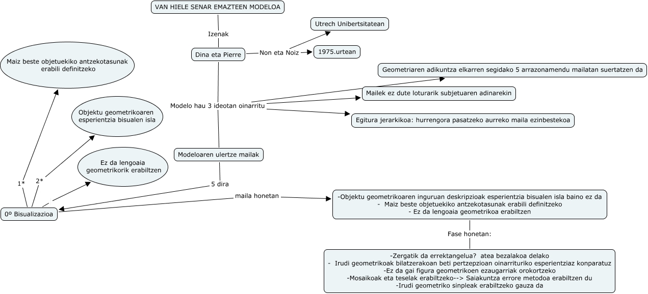 Este Cmap, tiene información relacionada con: mate mapa kontzeptuala ainho, 0º Bisualizazioa Ez da lengoaia geometrikorik erabiltzen, Dina eta Pierre Non eta Noiz Utrech Unibertsitatean, Dina eta Pierre Modelo hau 3 ideotan oinarritu Geometriaren adikuntza elkarren segidako 5 arrazonamendu mailatan suertatzen da, 0º Bisualizazioa 2* Objektu geometrikoaren esperientzia bisualen isla, VAN HIELE SENAR EMAZTEEN MODELOA Izenak Dina eta Pierre, Dina eta Pierre Modelo hau 3 ideotan oinarritu Egitura jerarkikoa: hurrengora pasatzeko aurreko maila ezinbestekoa, Dina eta Pierre Modelo hau 3 ideotan oinarritu Modeloaren ulertze mailak, -Objektu geometrikoaren inguruan deskripzioak esperientzia bisualen isla baino ez da - Maiz beste objetuekiko antzekotasunak erabili definitzeko - Ez da lengoaia geometrikoa erabiltzen Fase honetan: -Zergatik da errektangelua? atea bezalakoa delako - Irudi geometrikoak bilatzerakoan beti pertzepzioan oinarrituriko esperientziaz konparatuz -Ez da gai figura geometrikoen ezaugarriak orokortzeko -Mosaikoak eta teselak erabiltzeko--> Saiakuntza errore metodoa erabiltzen du -Irudi geometriko sinpleak erabiltzeko gauza da, Dina eta Pierre Modelo hau 3 ideotan oinarritu Mailek ez dute loturarik subjetuaren adinarekin, Dina eta Pierre Non eta Noiz 1975.urtean, Modeloaren ulertze mailak 5 dira 0º Bisualizazioa, 0º Bisualizazioa maila honetan -Objektu geometrikoaren inguruan deskripzioak esperientzia bisualen isla baino ez da - Maiz beste objetuekiko antzekotasunak erabili definitzeko - Ez da lengoaia geometrikoa erabiltzen, 0º Bisualizazioa 1* Maiz beste objetuekiko antzekotasunak erabili definitzeko