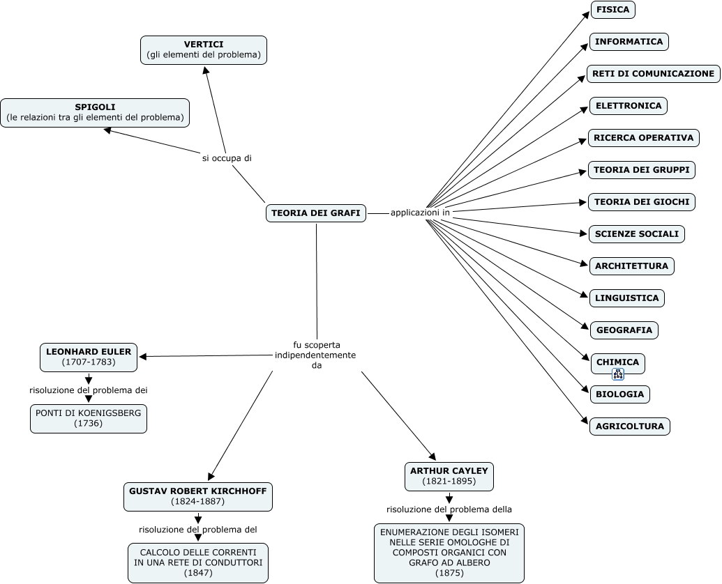 Questa Cmap, creata con IHMC CmapTools, contiene informazioni relative a: GRAFI - 01, TEORIA DEI GRAFI applicazioni in CHIMICA, TEORIA DEI GRAFI applicazioni in SCIENZE SOCIALI, LEONHARD EULER (1707-1783) risoluzione del problema dei PONTI DI KOENIGSBERG (1736), TEORIA DEI GRAFI applicazioni in GEOGRAFIA, TEORIA DEI GRAFI applicazioni in LINGUISTICA, TEORIA DEI GRAFI applicazioni in FISICA, GUSTAV ROBERT KIRCHHOFF (1824-1887) risoluzione del problema del CALCOLO DELLE CORRENTI IN UNA RETE DI CONDUTTORI (1847), TEORIA DEI GRAFI si occupa di SPIGOLI (le relazioni tra gli elementi del problema), TEORIA DEI GRAFI applicazioni in ARCHITETTURA, TEORIA DEI GRAFI fu scoperta indipendentemente da GUSTAV ROBERT KIRCHHOFF (1824-1887), TEORIA DEI GRAFI si occupa di VERTICI (gli elementi del problema), TEORIA DEI GRAFI applicazioni in RICERCA OPERATIVA, ARTHUR CAYLEY (1821-1895) risoluzione del problema della ENUMERAZIONE DEGLI ISOMERI NELLE SERIE OMOLOGHE DI COMPOSTI ORGANICI CON GRAFO AD ALBERO (1875), TEORIA DEI GRAFI applicazioni in TEORIA DEI GIOCHI, TEORIA DEI GRAFI applicazioni in BIOLOGIA, TEORIA DEI GRAFI fu scoperta indipendentemente da LEONHARD EULER (1707-1783), TEORIA DEI GRAFI applicazioni in INFORMATICA, TEORIA DEI GRAFI applicazioni in RETI DI COMUNICAZIONE, TEORIA DEI GRAFI applicazioni in AGRICOLTURA, TEORIA DEI GRAFI applicazioni in TEORIA DEI GRUPPI