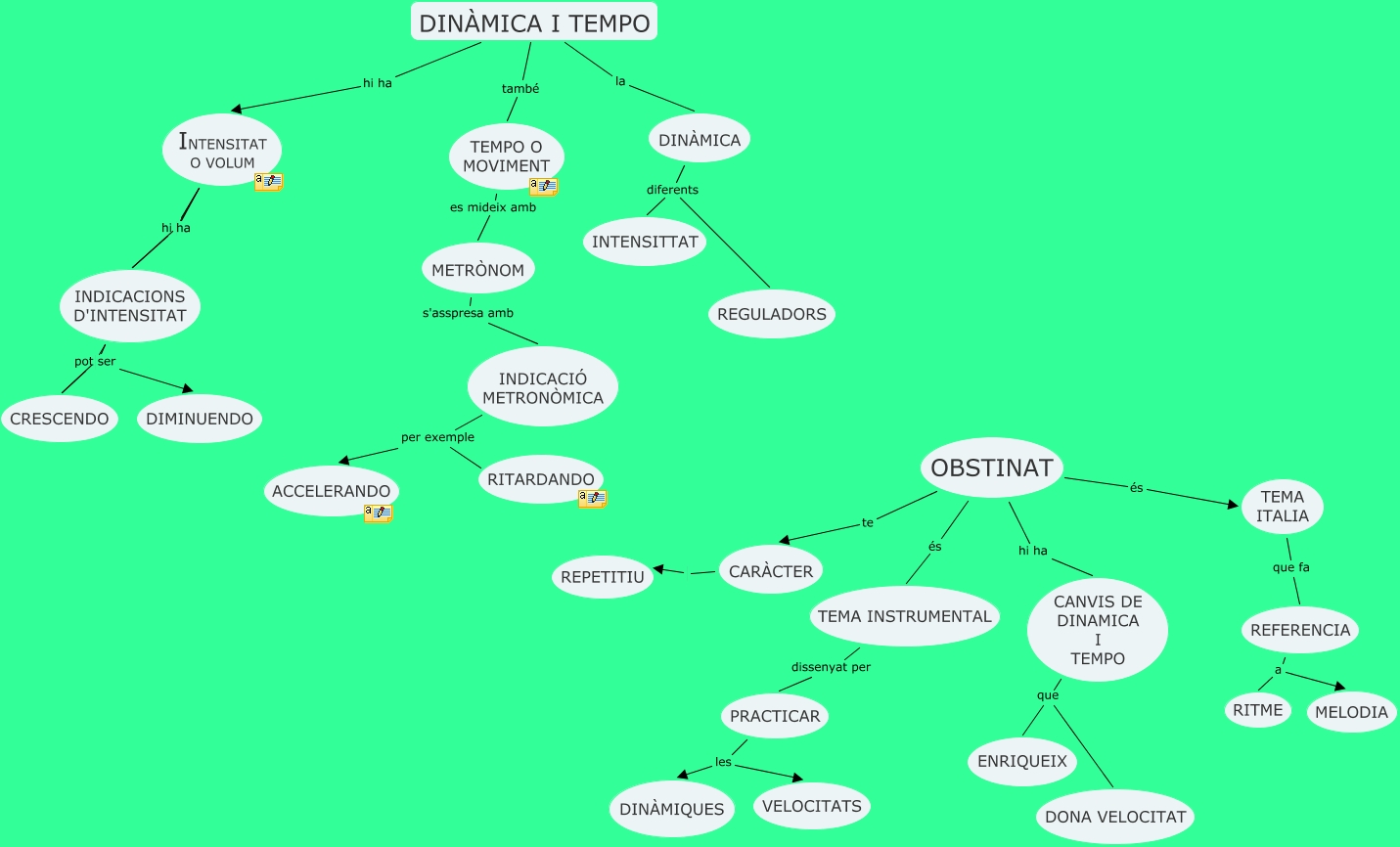 Este Cmap, tiene información relacionada con: T-3 (OBSTINAT), INDICACIÓ METRONÒMICA per exemple RITARDANDO, INTENSITAT O VOLUM INDICACIONS D'INTENSITAT, CARÀCTER REPETITIU, INDICACIONS D'INTENSITAT CRESCENDO, DINÀMICA I TEMPO també TEMPO O MOVIMENT, DINÀMICA diferents REGULADORS, INDICACIONS D'INTENSITAT pot ser DIMINUENDO, CANVIS DE DINAMICA I TEMPO que ENRIQUEIX, OBSTINAT hi ha CANVIS DE DINAMICA I TEMPO, CANVIS DE DINAMICA I TEMPO que DONA VELOCITAT, TEMPO O MOVIMENT es mideix amb METRÒNOM, TEMA INSTRUMENTAL dissenyat per PRACTICAR, INTENSITAT O VOLUM INDICACIONS D'INTENSITAT, OBSTINAT te CARÀCTER, REFERENCIA a MELODIA, TEMA ITALIA que fa REFERENCIA, PRACTICAR les DINÀMIQUES, DINÀMICA I TEMPO la DINÀMICA, OBSTINAT és TEMA ITALIA, INDICACIÓ METRONÒMICA per exemple ACCELERANDO