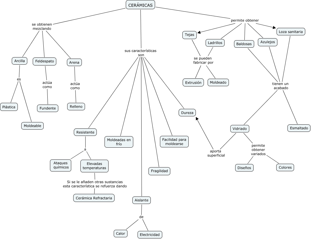 Este Cmap, tiene información relacionada con: T2-4_Irene, CERÁMICAS permite obtener Loza sanitaria, CERÁMICAS sus características son Facilidad para moldearse, CERÁMICAS permite obtener Ladrillos, Feldespato actúa como Fundente, Baldosas tienen un acabado Esmaltado, CERÁMICAS sus características son Aislante, CERÁMICAS sus características son Resistente, CERÁMICAS permite obtener Azulejos, Azulejos tienen un acabado Esmaltado, Ladrillos se pueden fabricar por Moldeado, CERÁMICAS se obtienen mezclando Feldespato, Aislante de Calor, Aislante de Electricidad, Arcilla es Plástica, Loza sanitaria tienen un acabado Vidriado, Vidriado permite obtener variados Diseños, Arena actúa como Relleno, Azulejos tienen un acabado Vidriado, CERÁMICAS se obtienen mezclando Arcilla, CERÁMICAS se obtienen mezclando Arena