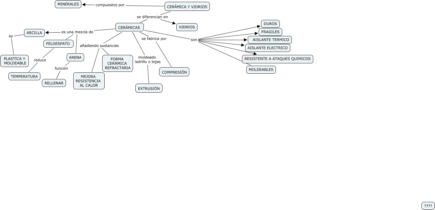 Este Cmap, tiene información relacionada con: 3ESOP38-LauraSergioEduCarlos, ARENA función RELLENAR, CERÁMICAS se fabrica por COMPRESIÓN, CERÁMICA Y VIDRIOS se diferencian en VIDRIOS, CERÁMICAS moldeado ladrillo o tejas EXTRUSIÓN, CERÁMICAS son DUROS, CERÁMICAS son RESISTENTE A ATAQUES QUIMICOS, CERÁMICAS es una mezcla de ARENA, CERÁMICA Y VIDRIOS se diferencian en CERÁMICAS, CERÁMICAS añadiendo sustancias FORMA CERÁMICA REFRACTARIA, CERÁMICAS son AISLANTE TERMICO, CERÁMICAS es una mezcla de ARCILLA, ARCILLA es PLASTICA Y MOLDEABLE, CERÁMICA Y VIDRIOS compuestos por MINERALES, CERÁMICAS son FRAGILES, CERÁMICAS son AISLANTE ELECTRICO, CERÁMICAS es una mezcla de FELDESPATO, CERÁMICAS son MOLDEABLES, FELDESPATO reduce TEMPERATURA, CERÁMICAS añadiendo sustancias MEJORA RESISTENCIA AL CALOR