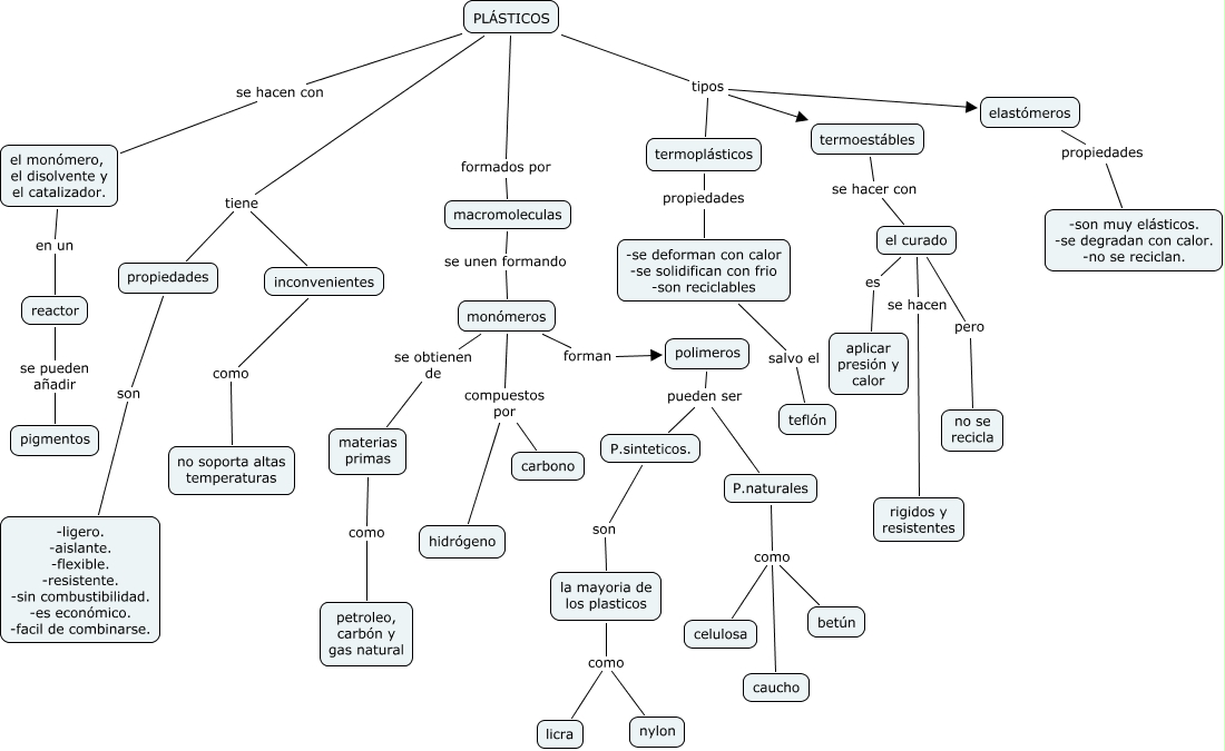 Este Cmap, tiene información relacionada con: los plasticos diego alvarez, PLÁSTICOS formados por macromoleculas, termoplásticos propiedades -se deforman con calor -se solidifican con frio -son reciclables, propiedades son -ligero. -aislante. -flexible. -resistente. -sin combustibilidad. -es económico. -facil de combinarse., el curado pero no se recicla, PLÁSTICOS tiene propiedades, monómeros se obtienen de materias primas, monómeros compuestos por carbono, monómeros forman polimeros, P.sinteticos. son la mayoria de los plasticos, polimeros pueden ser P.sinteticos., macromoleculas se unen formando monómeros, monómeros compuestos por hidrógeno, P.naturales como caucho, elastómeros propiedades -son muy elásticos. -se degradan con calor. -no se reciclan., el curado se hacen rigidos y resistentes, inconvenientes como no soporta altas temperaturas, P.naturales como celulosa, reactor se pueden añadir pigmentos, PLÁSTICOS tiene inconvenientes, termoestábles se hacer con el curado