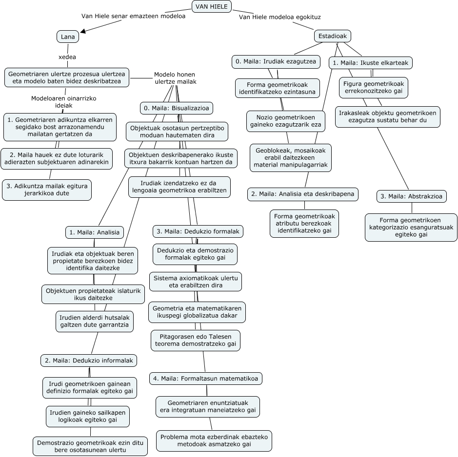 Este Cmap, tiene información relacionada con: miren, 1. Maila: Analisia ???? Objektuen propietateak islaturik ikus daitezke, Estadioak ???? 2. Maila: Analisia eta deskribapena, 3. Maila: Dedukzio formalak ???? Pitagorasen edo Talesen teorema demostratzeko gai, 1. Maila: Ikuste elkarteak ???? Irakasleak objektu geometrikoen ezagutza sustatu behar du, 4. Maila: Formaltasun matematikoa ???? Problema mota ezberdinak ebazteko metodoak asmatzeko gai, 3. Maila: Dedukzio formalak ???? Sistema axiomatikoak ulertu eta erabiltzen dira, 2. Maila: Dedukzio informalak ???? Demostrazio geometrikoak ezin ditu bere osotasunean ulertu, 3. Maila: Dedukzio formalak ???? Geometria eta matematikaren ikuspegi globalizatua dakar, 0. Maila: Bisualizazioa ???? Irudiak izendatzeko ez da lengoaia geometrikoa erabiltzen, Geometriaren ulertze prozesua ulertzea eta modelo baten bidez deskribatzea Modeloaren oinarrizko ideiak 2. Maila hauek ez dute loturarik adierazten subjektuaren adinarekin, 0. Maila: Irudiak ezagutzea ???? Geoblokeak, mosaikoak erabil daitezkeen material manipulagarriak, 1. Maila: Ikuste elkarteak ???? Figura geometrikoak errekonozitzeko gai, Geometriaren ulertze prozesua ulertzea eta modelo baten bidez deskribatzea Modelo honen ulertze mailak 2. Maila: Dedukzio informalak, Geometriaren ulertze prozesua ulertzea eta modelo baten bidez deskribatzea Modelo honen ulertze mailak 3. Maila: Dedukzio formalak, 2. Maila: Analisia eta deskribapena ???? Forma geometrikoak atributu berezkoak identifikatzeko gai, 4. Maila: Formaltasun matematikoa ???? Geometriaren enuntziatuak era integratuan maneiatzeko gai, Estadioak ???? 0. Maila: Irudiak ezagutzea, 0. Maila: Irudiak ezagutzea ???? Forma geometrikoak identifikatzeko ezintasuna, Geometriaren ulertze prozesua ulertzea eta modelo baten bidez deskribatzea Modeloaren oinarrizko ideiak 3. Adikuntza mailak egitura jerarkikoa dute, 3. Maila: Dedukzio formalak ???? Dedukzio eta demostrazio formalak egiteko gai