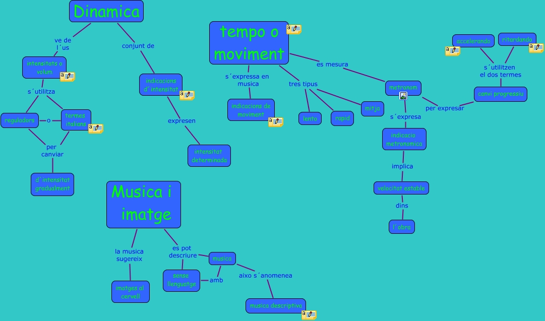 Este Cmap, tiene información relacionada con: Tema 3, termes italians o reguladors, tempo o moviment tres tipus rapid, tempo o moviment s´expressa en musica indicacions de moviment, tempo o moviment tres tipus mitja, tempo o moviment es mesura metronom, velocitat estable dins l´obra, intensitats o volum s´utilitza termes italians, Musica i imatge es pot descriure sense llenguatge, musica aixo s´anomenea musica descriptiva, Dinamica conjunt de indicacions d´intensitat, termes italians per canviar d´intensitat gradualment, canvi progressiu s´utilitzen el dos termes ritardando, indicacio metronomica implica velocitat estable, reguladors per canviar d´intensitat gradualment, metronom s´expresa indicacio metronomica, sense llenguatge amb musica, intensitats o volum s´utilitza reguladors, Dinamica ve de l´us intensitats o volum, indicacions d´intensitat expresen intensitat determinada, musica es pot descriure sense llenguatge