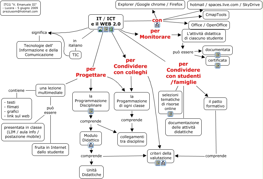 Questa Cmap, creata con IHMC CmapTools, contiene informazioni relative a: Home Page, la Programmazione Disciplinare comprende collegamenti tra discipline, Modulo Didattico comprende criteri della valutazione, una lezione multimediale contiene - testi - filmati - grafici - link sul web, la Programmazione Disciplinare comprende Modulo Didattico, L'attività didattica di ciascuno studente può essere documentata, IT / ICT e il WEB 2.0 per Progettare una lezione multimediale, TIC significa Tecnologie dell' Informazione e della Comunicazione, una lezione multimediale può essere fruita in Internet dallo studente, Modulo Didattico comprende Unità Didattiche, IT / ICT e il WEB 2.0 con Explorer /Google chrome / Firefox, IT / ICT e il WEB 2.0 per Condividere con colleghi criteri della valutazione, IT / ICT e il WEB 2.0 con hotmail / spaces.live.com / SkyDrive, IT / ICT e il WEB 2.0 per Condividere con colleghi la Progammazione di ogni classe, L'attività didattica di ciascuno studente può essere certificata, il patto formativo comprende criteri della valutazione, IT / ICT e il WEB 2.0 per Condividere con studenti /famiglie il patto formativo, una lezione multimediale può essere presentata in classe (LIM / aula info / postazione mobile), IT / ICT e il WEB 2.0 con Office / OpenOffice, IT / ICT e il WEB 2.0 per Progettare la Progammazione di ogni classe, IT / ICT e il WEB 2.0 con CmapTools