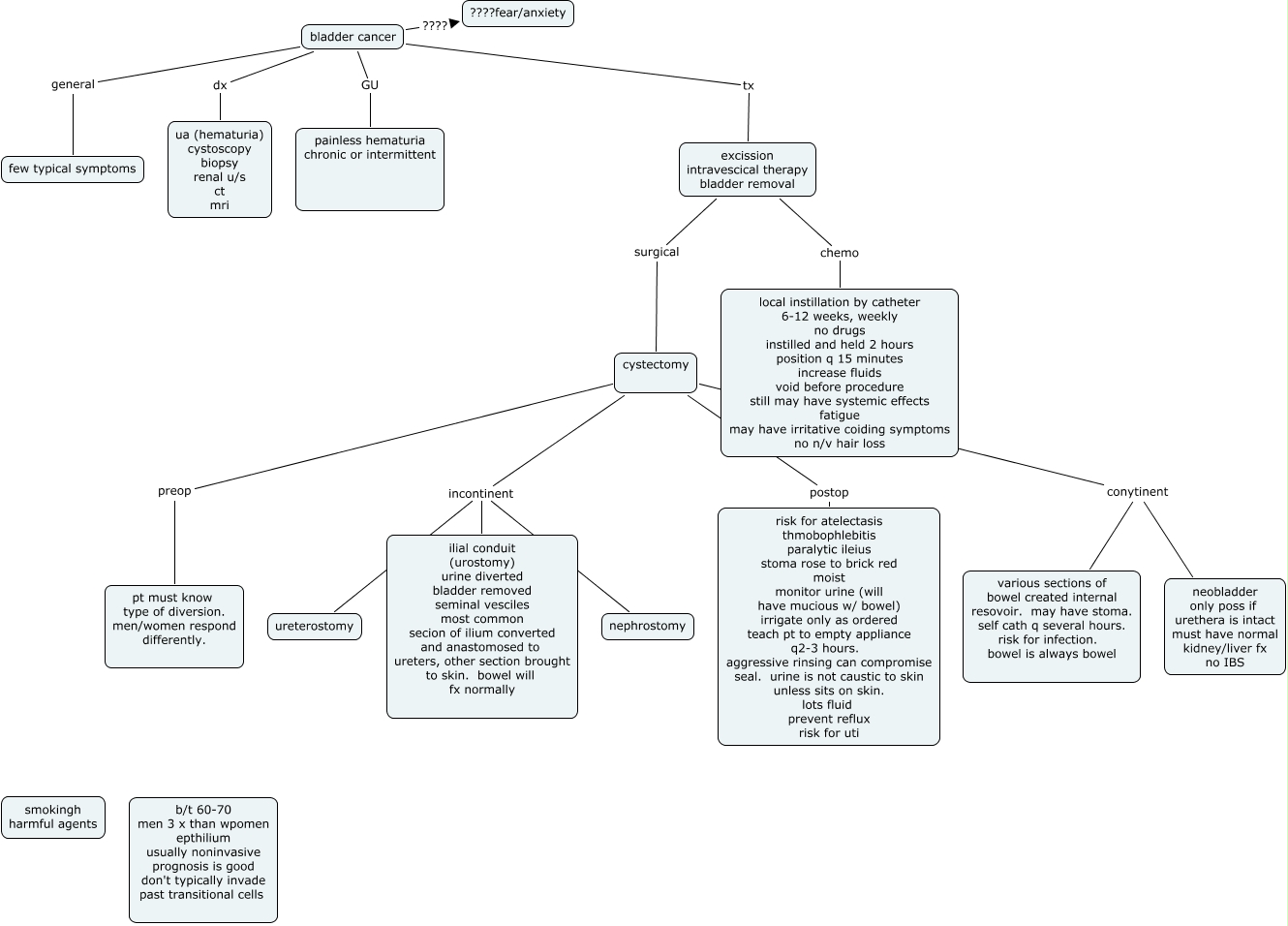 This Concept Map, created with IHMC CmapTools, has information related to: bladder CA, bladder cancer dx ua (hematuria) cystoscopy biopsy renal u/s ct mri, cystectomy conytinent neobladder only poss if urethera is intact must have normal kidney/liver fx no IBS, bladder cancer tx excission intravescical therapy bladder removal, bladder cancer GU painless hematuria chronic or intermittent, cystectomy preop pt must know type of diversion. men/women respond differently., bladder cancer ???? ????fear/anxiety, excission intravescical therapy bladder removal surgical cystectomy, bladder cancer general few typical symptoms, cystectomy incontinent nephrostomy, cystectomy conytinent various sections of bowel created internal resovoir. may have stoma. self cath q several hours. risk for infection. bowel is always bowel, cystectomy postop risk for atelectasis thmobophlebitis paralytic ileius stoma rose to brick red moist monitor urine (will have mucious w/ bowel) irrigate only as ordered teach pt to empty appliance q2-3 hours. aggressive rinsing can compromise seal. urine is not caustic to skin unless sits on skin. lots fluid prevent reflux risk for uti, cystectomy incontinent ureterostomy, excission intravescical therapy bladder removal chemo local instillation by catheter 6-12 weeks, weekly no drugs instilled and held 2 hours position q 15 minutes increase fluids void before procedure still may have systemic effects fatigue may have irritative coiding symptoms no n/v hair loss, cystectomy incontinent ilial conduit (urostomy) urine diverted bladder removed seminal vesciles most common secion of ilium converted and anastomosed to ureters, other section brought to skin. bowel will fx normally