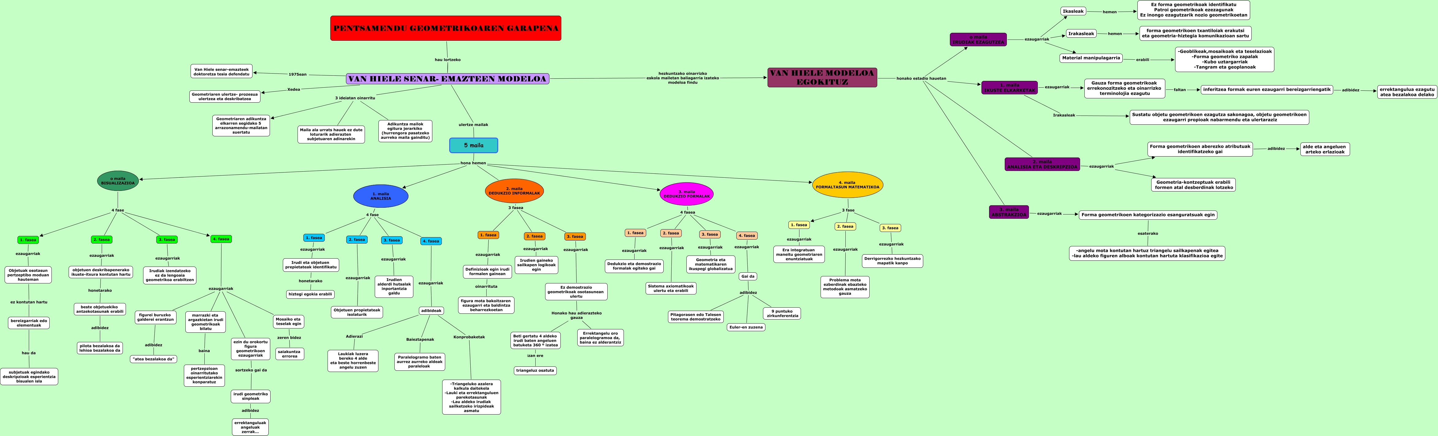 Este Cmap, tiene información relacionada con: Aranzabal Isasa, Leire, 3. maila ABSTRAKZIOA ezaugarriak Forma geometrikoen kategorizazio esanguratsuak egin, 1. maila ANALISIA 4 fase 1. fasea, o maila IRUDIAK EZAGUTZEA ezaugarriak Irakasleak, objetuen deskribapenerako ikuste-itxura kontutan hartu honetarako beste objetuekiko antzekotasunak erabili, adibideak Baieztapenak Paralelogramo baten aurrez aurreko aldeak paraleloak, 5 maila hona hemen 3. maila DEDUKZIO FORMALAK, beste objetuekiko antzekotasunak erabili adibidez pilota bezalakoa da lehioa bezalakoa da, 4. fasea ezaugarriak figurei buruzko galderei erantzun, o maila BISUALIZAZIOA 4 fase 3. fasea, Forma geometrikoen aberezko atributuak identifikatzeko gai adibidez alde eta angeluen arteko erlazioak, 3. fasea ezaugarriak Irudiak izendatzeko ez da lengoaia geometrikoa erabiltzen, Ez demostrazio geometrikoak osotasunean ulertu Honako hau adierazteko gauza Errektangelu oro paralelogramoa da, baina ez alderantziz, 2. fasea ezaugarriak Irudien gaineko sailkapen logikoak egin, 1. maila ANALISIA 4 fase 4. fasea, marrazki eta argazkietan irudi geometrikoak bilatu baina pertzepzioan oinarritutako esperientziarekin konparatuz, VAN HIELE SENAR- EMAZTEEN MODELOA 3 ideiatan oinarritu Adikuntza mailok egitura jerarkiko (hurrengora pasatzeko aurreko maila gainditu), Irudi eta objetuen prepietateak identifikatu honetarako hiztegi egokia erabili, VAN HIELE SENAR- EMAZTEEN MODELOA 1975ean Van Hiele senar-emazteek doktoretza tesia defendatu, Gauza forma geometrikoak errekonozitzeko eta oinarrizko terminolojia ezagutu faltan inferitzea formak euren ezaugarri bereizgarriengatik, 3. fasea ezaugarriak Ez demostrazio geometrikoak osotasunean ulertu