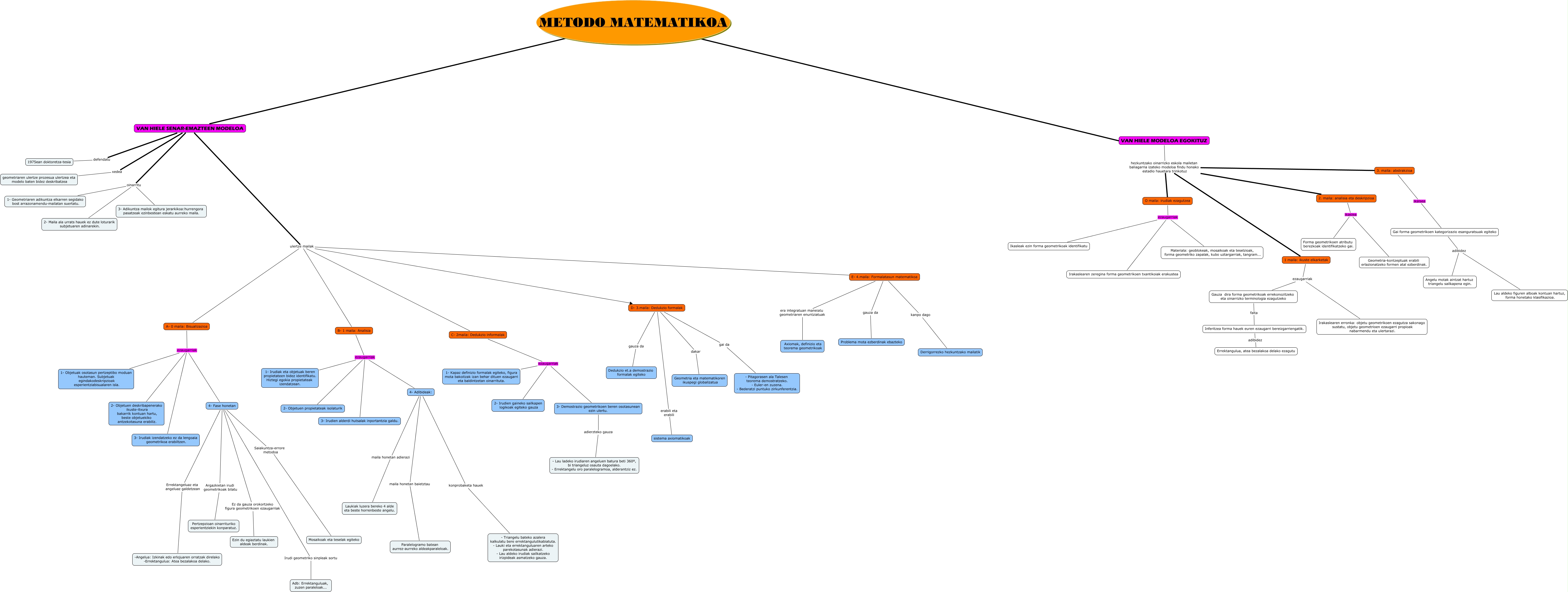 Este Cmap, tiene información relacionada con: Itsaso Gallastegi Loiti-van hiele, A- 0 maila: Bisualizazioa ezaugarriak 3- Irudiak izendatzeko ez da lengoaia geometrikoa erabiltzen., 4- Fase honetan Saiakuntza-errore metodoa Mosaikoak eta teselak egiteko, B- 1 maila: Analisia ezaugarriak 1- Irudiak eta objetuak beren propietateen bidez identifikatu. Hiztegi egokia propietateak izendatzean., 1 maila: ikuste elkarketak ezaugarriak Gauza dira forma geometrikoak errekonozitzeko eta oinarrizko terminologia ezagutzeko, 4- Adibideak: maila honetan baietztau Paralelogramo batean aurrez-aurreko aldeakparaleloak., O maila: irudiak ezagutzea ezaugarriak Irakaslearen zeregina forma geometrikoen txantikoiak erakustea, VAN HIELE SENAR-EMAZTEEN MODELOA defendatu 1975ean doktoretza-tesia, Inferitzea forma hauek euren ezaugarri bereizgarriengatik. adibidez Errektangulua, atea bezalakoa delako ezagutu, Gai forma geometrikoen kategorizazio esanguratsuak egiteko adibidez Angelu motak aintzat hartuz triangelu sailkapena egin., C- 2maila: Dedukzio informalak ezaugarriak 3- Demostrazio geometrikoen beren osotasunean ezin ulertu., VAN HIELE SENAR-EMAZTEEN MODELOA ulertze mailak C- 2maila: Dedukzio informalak, B- 1 maila: Analisia ezaugarriak 2- Objetuen propietateak isolaturik, VAN HIELE MODELOA EGOKITUZ hezkuntzako oinarrizko eskola mailetan baliagarria izateko modeloa findu honako estadio hauetara trinkotuz 1 maila: ikuste elkarketak, O maila: irudiak ezagutzea ezaugarriak Ikasleak ezin forma geometrikoak identifikatu, 1 maila: ikuste elkarketak ezaugarriak Irakaslearen erronka: objetu geometrikoen ezagutza sakonago sustatu, objetu geometrioen ezaugarri propioak nabarmendu eta ulertarazi., Gauza dira forma geometrikoak errekonozitzeko eta oinarrizko terminologia ezagutzeko falta Inferitzea forma hauek euren ezaugarri bereizgarriengatik., 4- Adibideak: konprobaketa hauek - Triangelu bateko azalera kalkulatu bere errektangulutikabiatuta. - Lauki eta errektanguluaren arteko parekotasunak adierazi. - Lau aldeko irudiak sailkatzeko irizpideak asmatzeko gauza., Gai forma geometrikoen kategorizazio esanguratsuak egiteko adibidez Lau aldeko figuren alboak kontuan hartuz, forma honetako klasifikazioa., 4- Fase honetan Irudi geometriko sinpleak sortu Adb: Errektanguluak, zuzen paraleloak..., A- 0 maila: Bisualizazioa ezaugarriak 4- Fase honetan