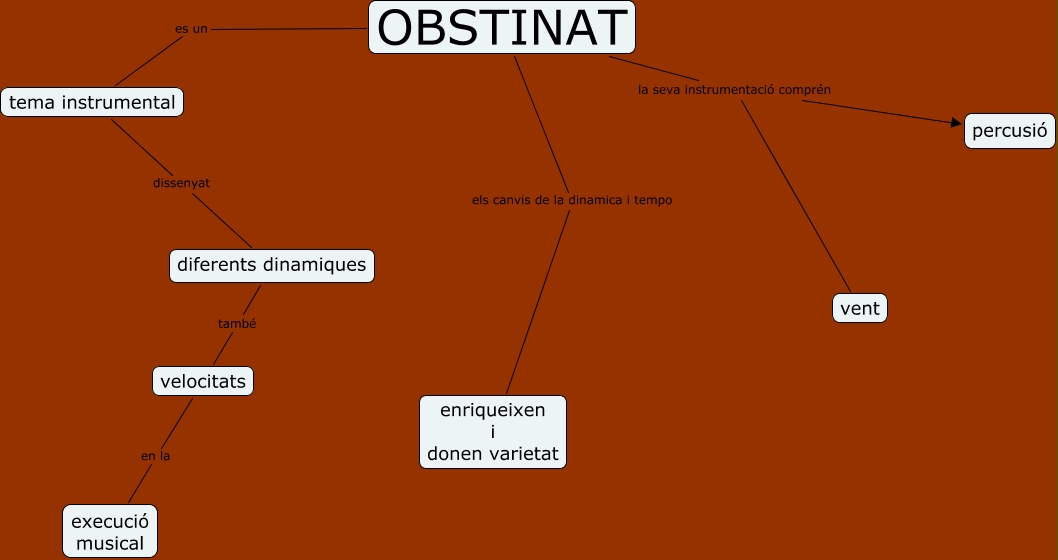 Este Cmap, tiene información relacionada con: marc balle-obstinat, diferents dinamiques també velocitats, OBSTINAT els canvis de la dinamica i tempo enriqueixen i donen varietat, OBSTINAT la seva instrumentació comprén percusió, OBSTINAT la seva instrumentació comprén vent, OBSTINAT es un tema instrumental, velocitats en la execució musical, tema instrumental dissenyat diferents dinamiques